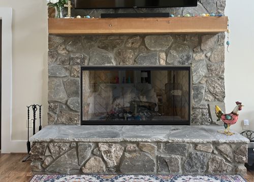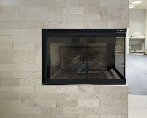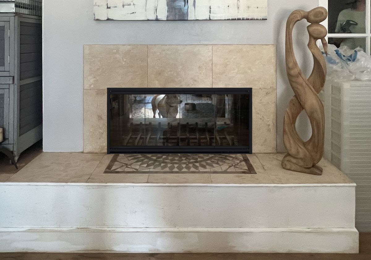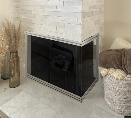 The Design Specialties Stiletto door has a normal frame thickness of 1 5/8", so it projects out with a box-like look. It can also be made with a "Cutback" frame that has a shallow 5/16" thick depth for a more custom flush appearance. The cutback frame should only be used with fireplaces that are perfectly square (within 1/16") due to the minimal overlap that is available.
