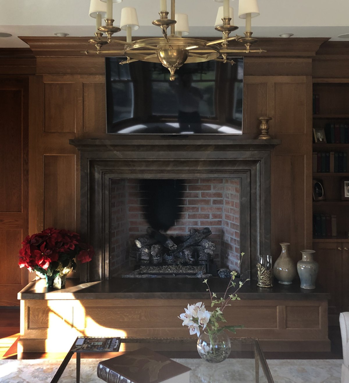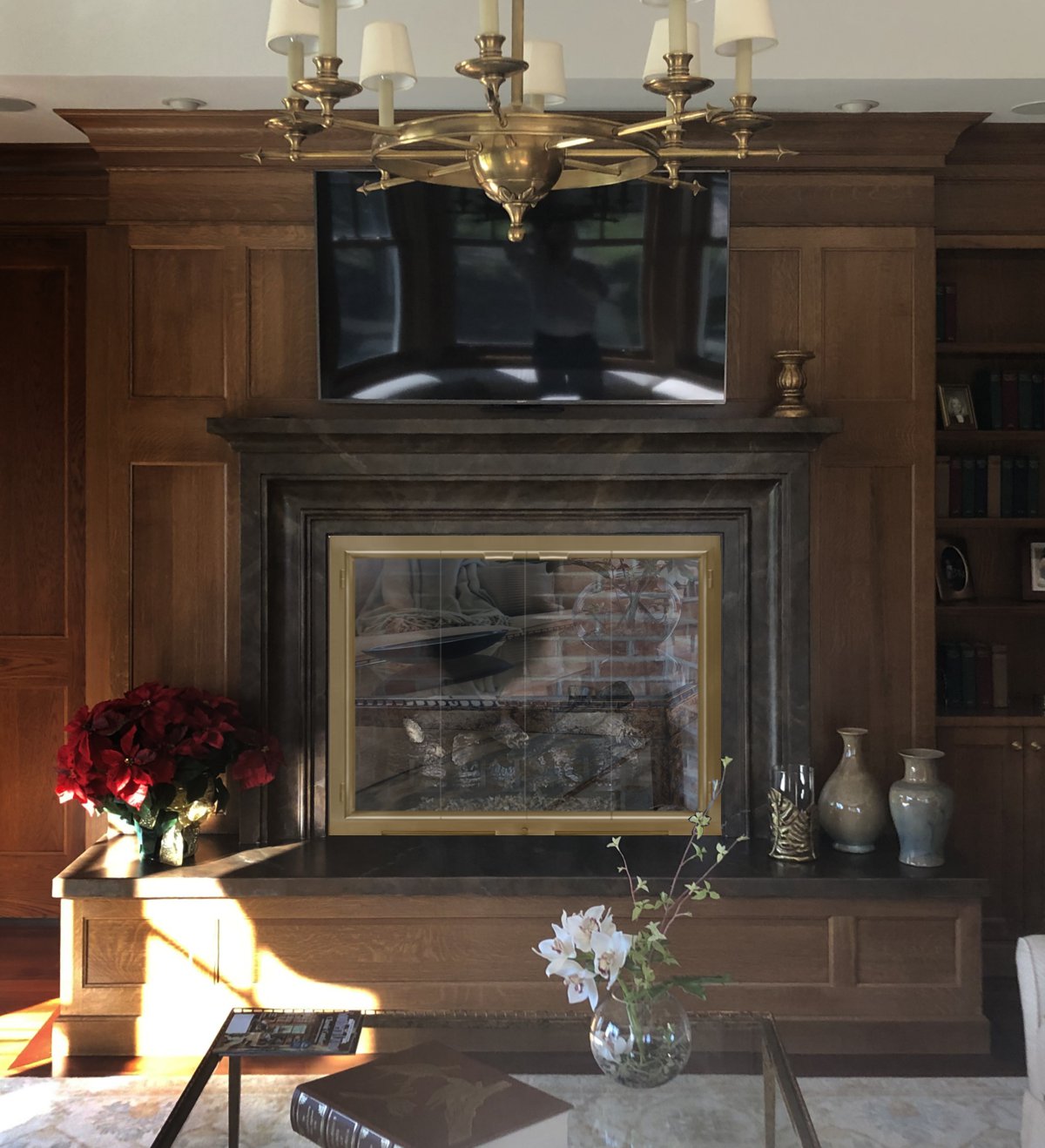 Option #3: HHFL-CVBF Solid Brass Fireplace Doors with Hidden Hinges and Reed and Ribbon Handles in Weathered Brass. Shown with No Damper at Bottom of Frame. We included a closeup of the handle sitting on the table. This is just a little flare to add a touch of class similar to what is at the bottom of your chandelier.