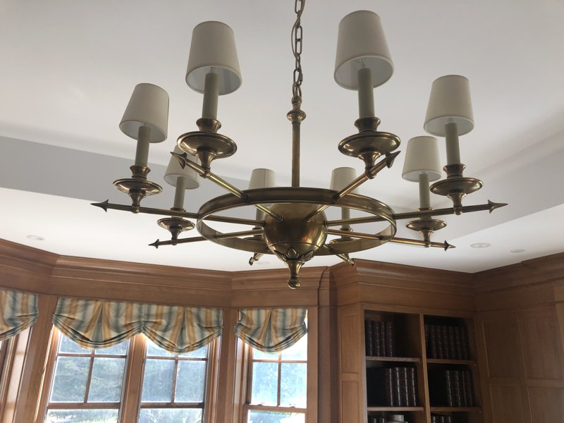 These doors are hand crafted by skilled artisans from Solid Brass. These doors are very high end, and very refined. Items made from solid brass come in a wide variety of Trims with Hand Crafted Patinas and Finishes. Weathered brass appears to be very close to your chandelier, so we have chosen that as our recommendation.