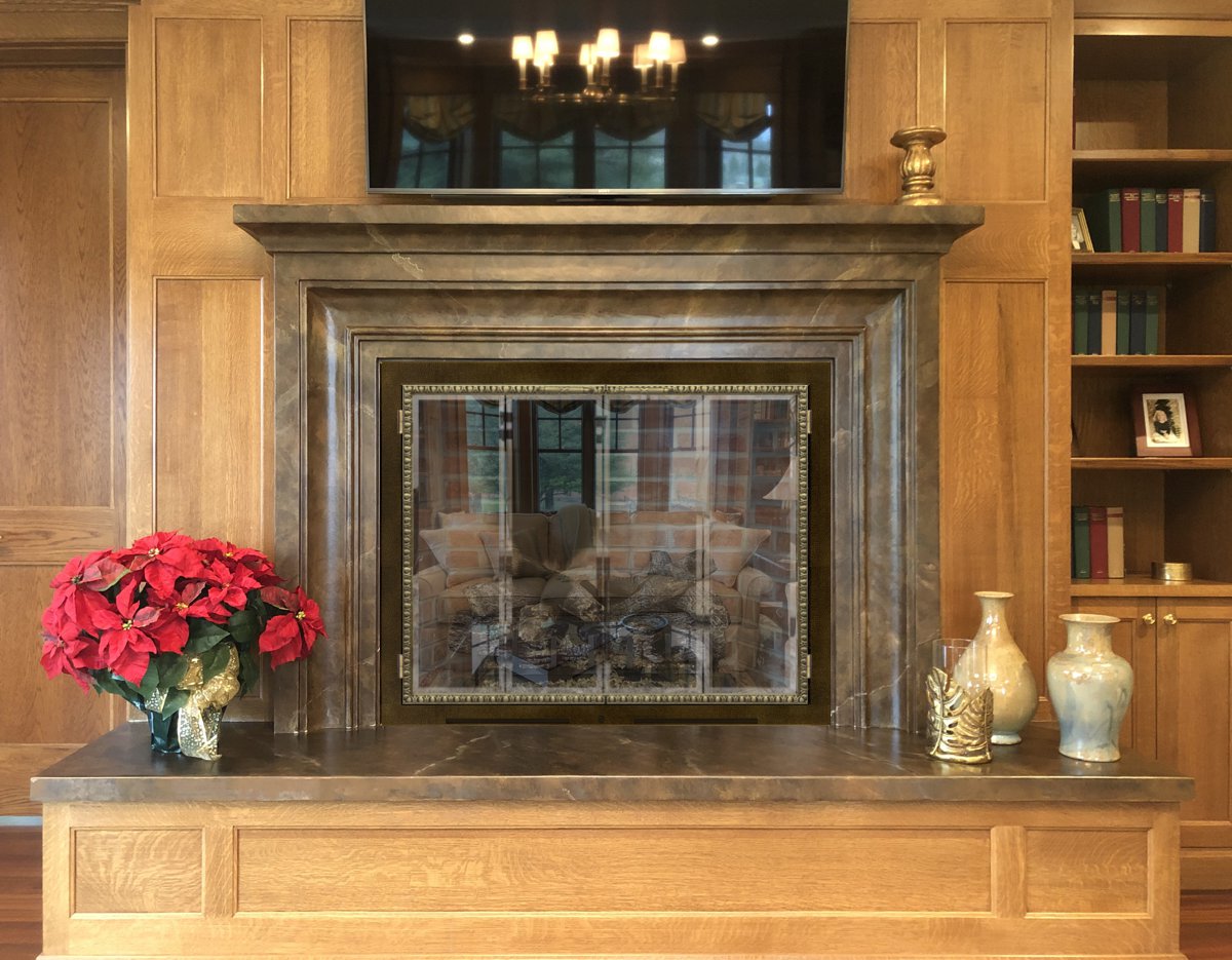 Our Comments: The doors featured below are the highest quality fireplace doors you can buy in the USA and are made to outlast the owner. Rust is not a factor as the brass is finished like fine jewelry and then coated with a baked on enamel that will last for many years, so there is no polishing necessary. The frame would be precision made to overlap the inner edge of your mantel within a 1 1/6" tolerance.