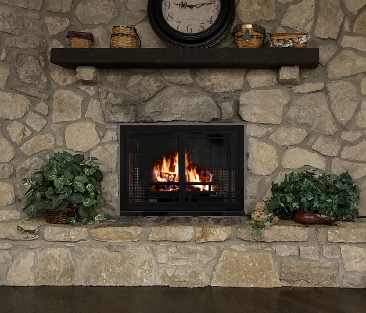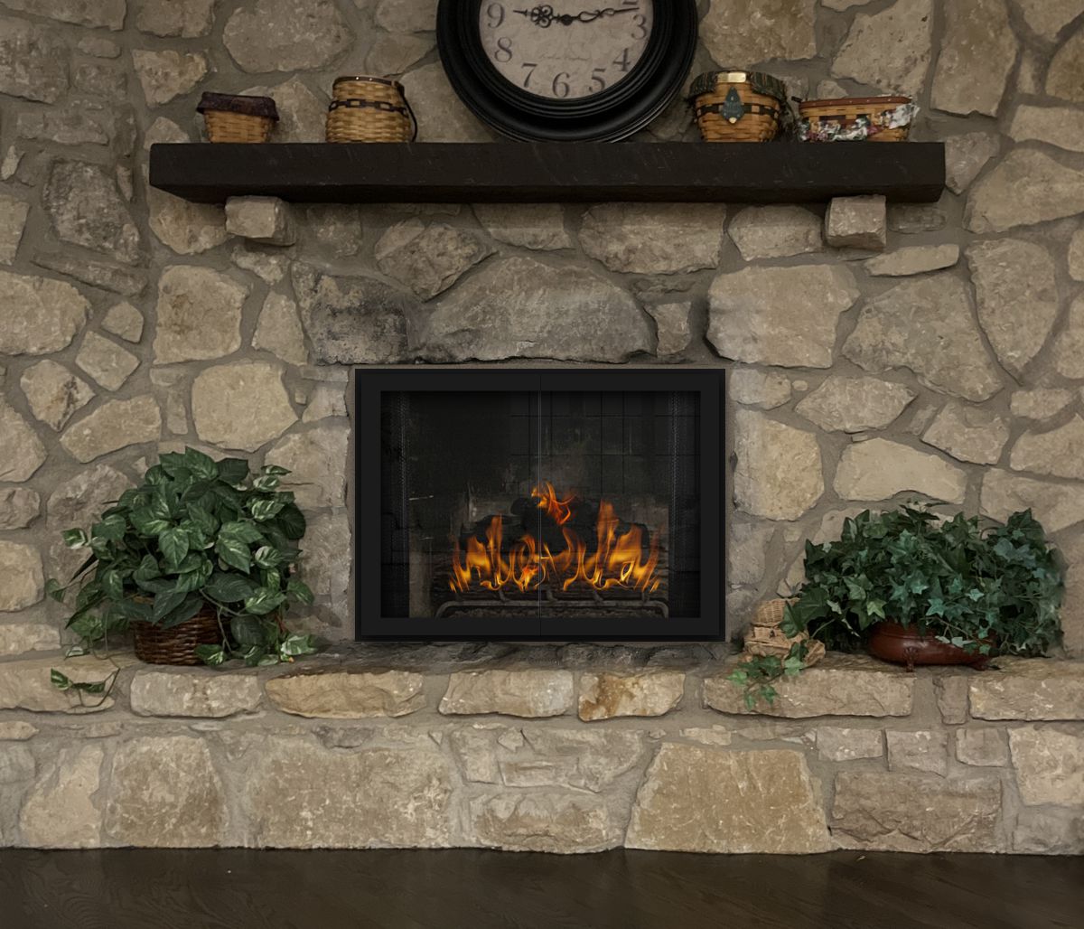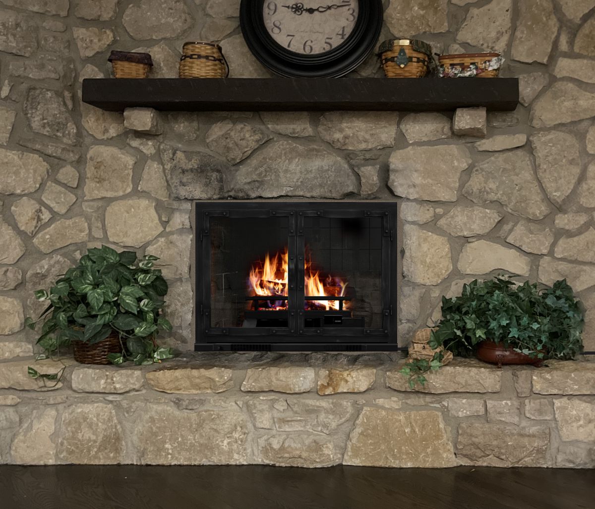 These doors are designed to work with a Grate Heater. They include a bottom draft for controlling combustion air and ceramic glass for burning with the doors closed. The first option does not have mesh behind the glass, so there is no spark protection when the doors are open. The other 3 options are available with optional gate mesh backup doors behind the glass for spark protection when the doors are open.