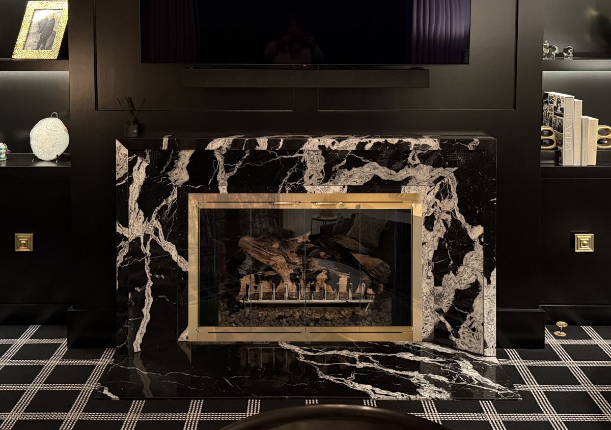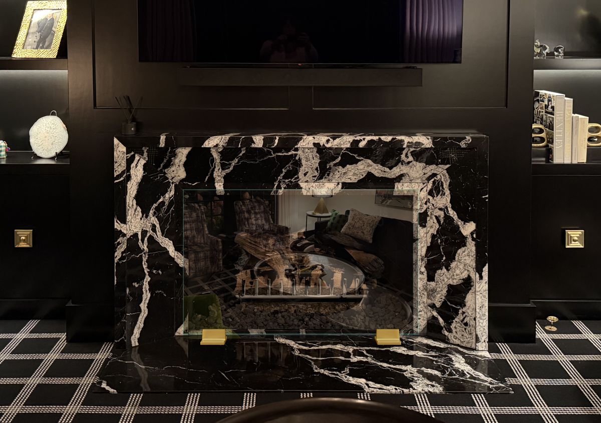 Our Comments: Looks like either polished brass or black with polished brass is in order for this modern room. Here are some different types of screens that can be made in those finishes to fit your fireplace.