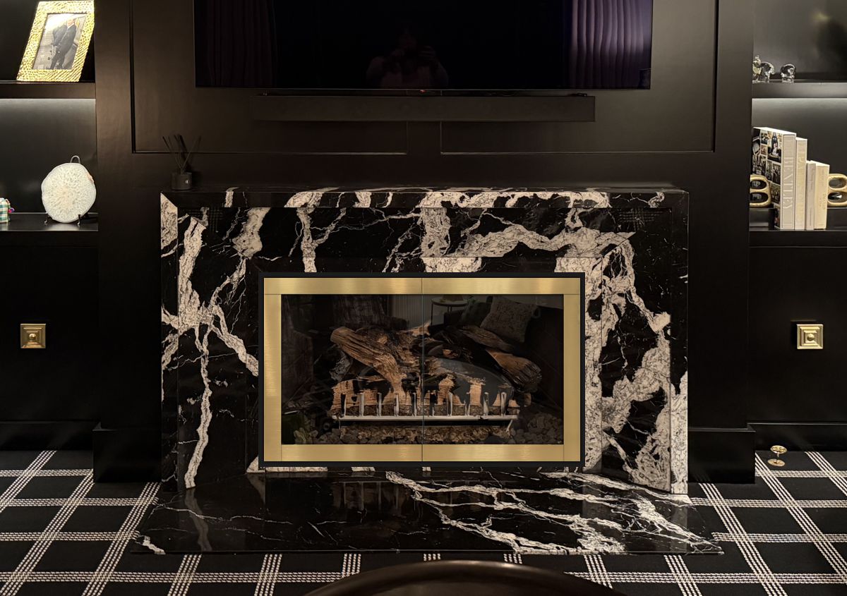 Option #6: Hearth Creations Modern-1 Sleek Steel Fireplace Door with No Visible Handles with Black Frame and Satin Brass Plated Overlay Doors with Clear Glass. Available with Optional AirWash System for Buring Fires with Doors Closed.