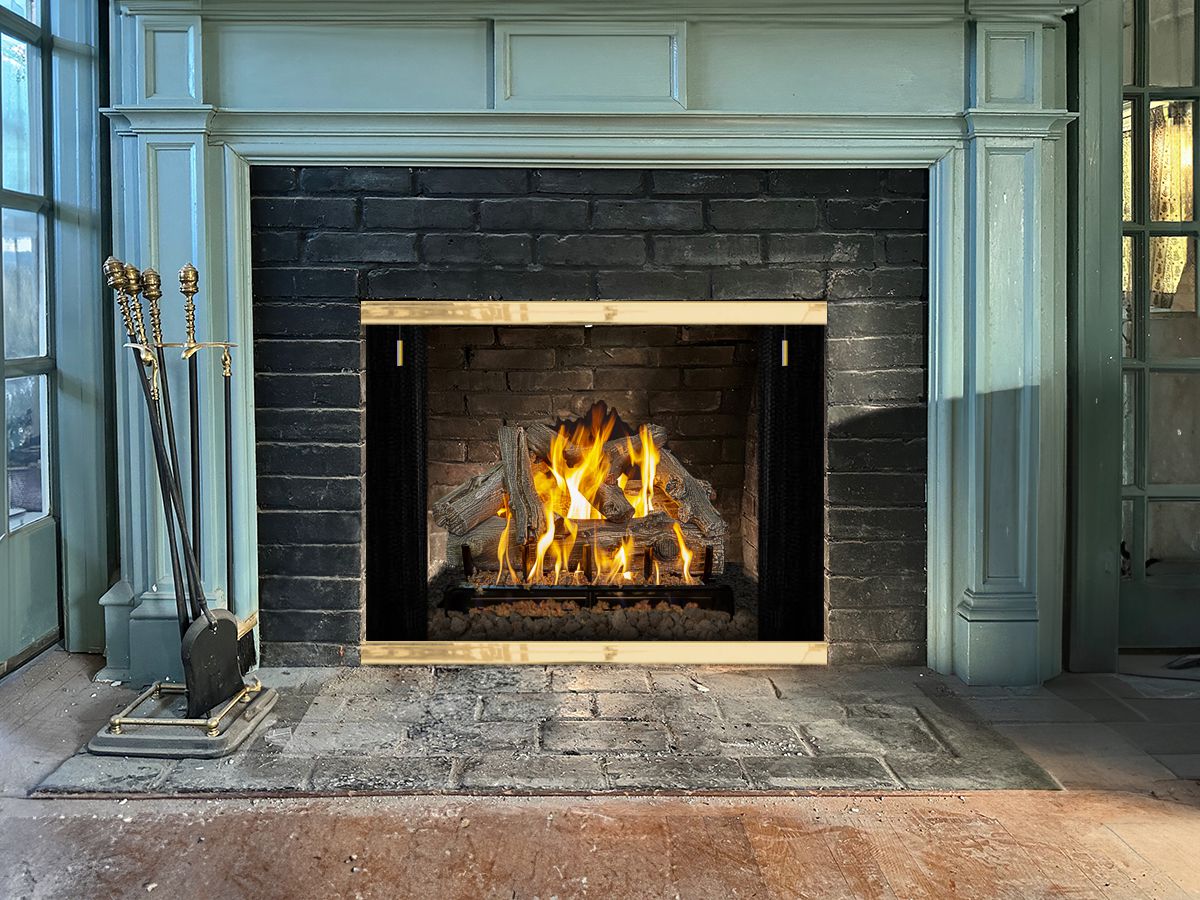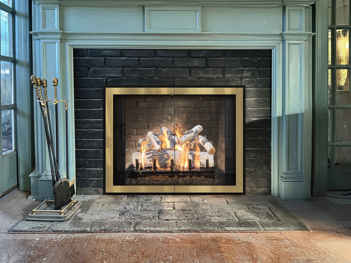 Option #5: Grand Canyon 24 Inch Quaking Aspen Gas Logs with 3-BURNER. Shown with Hearth Creations Modern-1 Fireplace Door with No Visible Handles in Black with Satin Brass Overlay Doors and Gas Log AirWash System for Buring Gas Fires with Doors Closed. Most other fireplace doors must be open when burning gas logs.