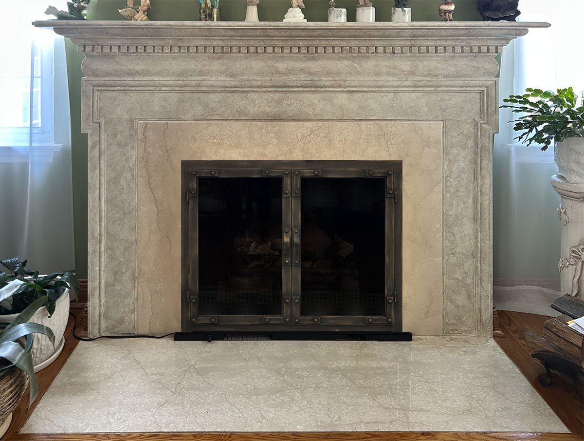 Option #5: Hearth Creations Iron Age 4 Cabinet Fireplace Glass Door with Corner Details and Rivets in Burnished Copper with Tempered or Ceramic Glass and Gate Mesh Backup Doors. Made from 3/16" Solid Steel Fitting Flat Against the Fireplace for a Cleaner, More Finished Look.