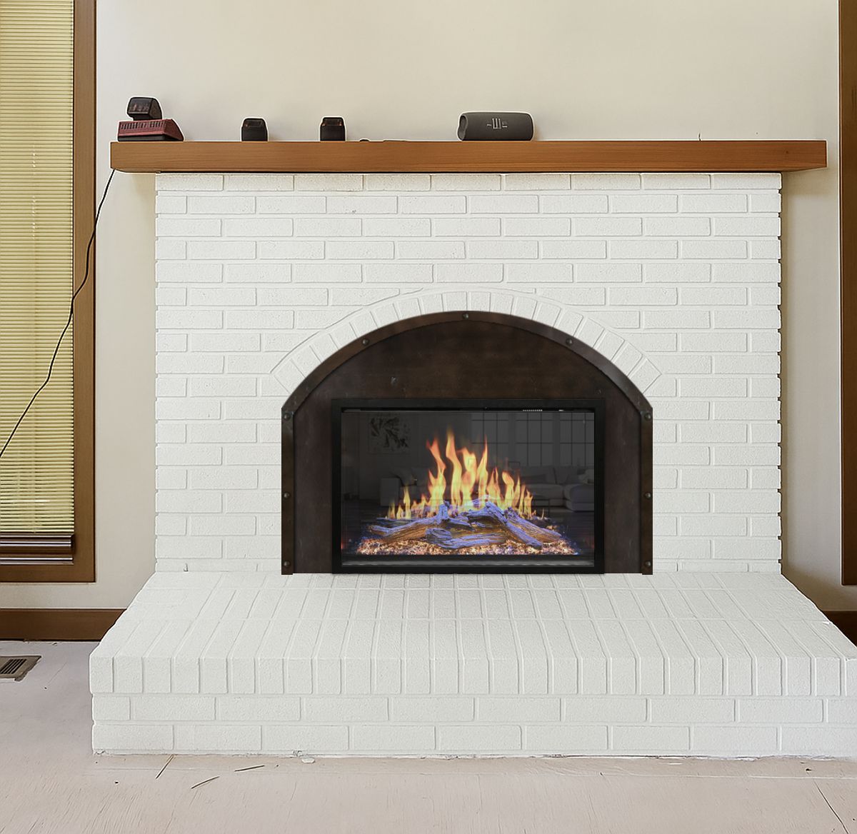 Option #: Modern Flames OR30-TRAD 30" Orion Electric Fireplace Insert with Custom Arch Surround in Medium Bronze with Matching Riveted Trim.