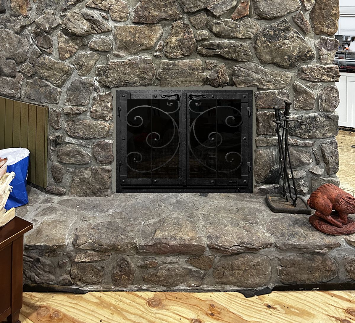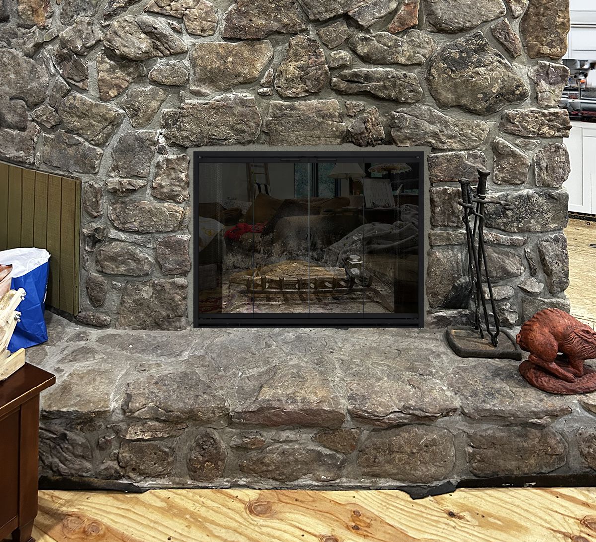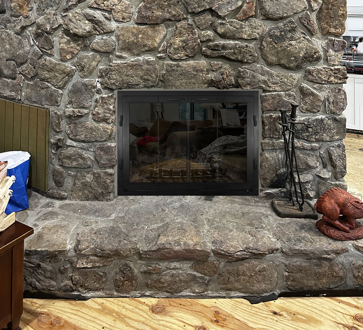 Customer Comments: Needing fireplace door quote. We are remodeling an old home with a rock fireplace. Needing a set of doors. Looking to mount angle iron on the inside of fireplace to mount the door. Open to other ideas for mounting. Width 40.5". Height: 31". Airseal Gasket Custom Fireplace Glass Door Matte Black. Gray glass. Mesh Screen. Bifold doors. Thanks