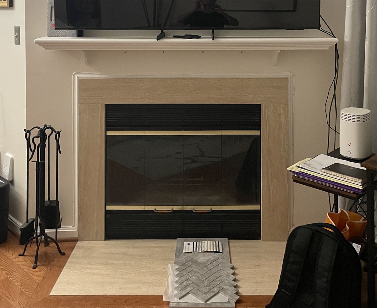 Customer Comments: This is a condo fireplace. Would like to demo the stone, replace doors, and will re-tile using the tile pcs sitting in front of the fireplace on the floor in the first picture.