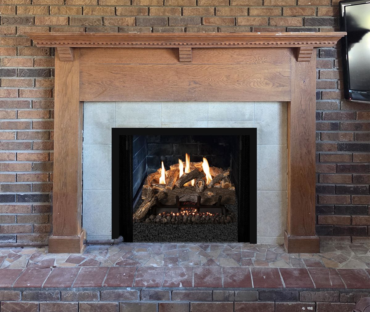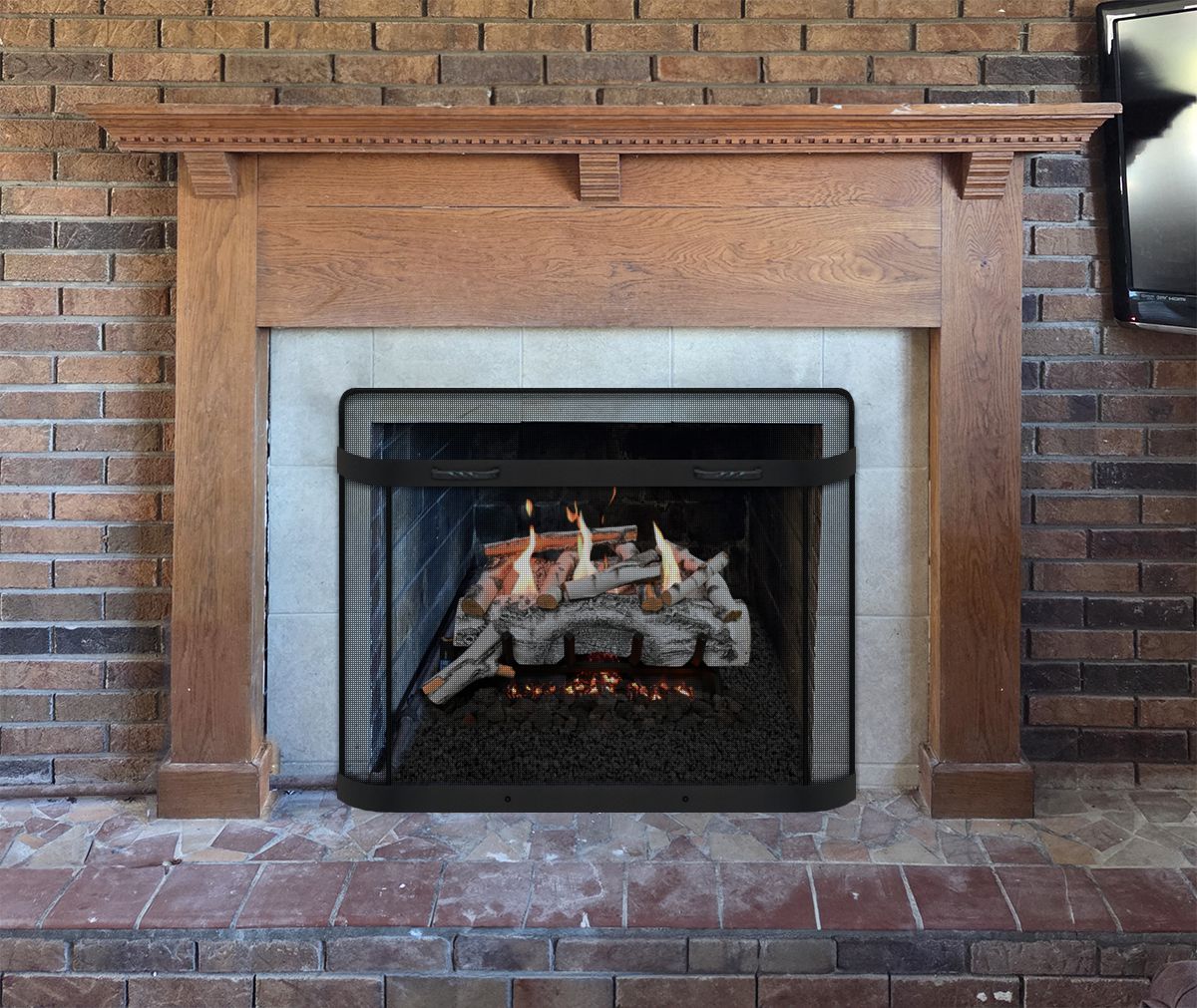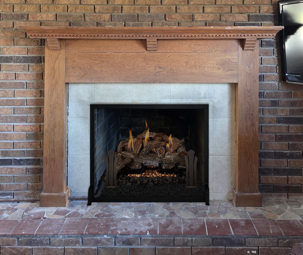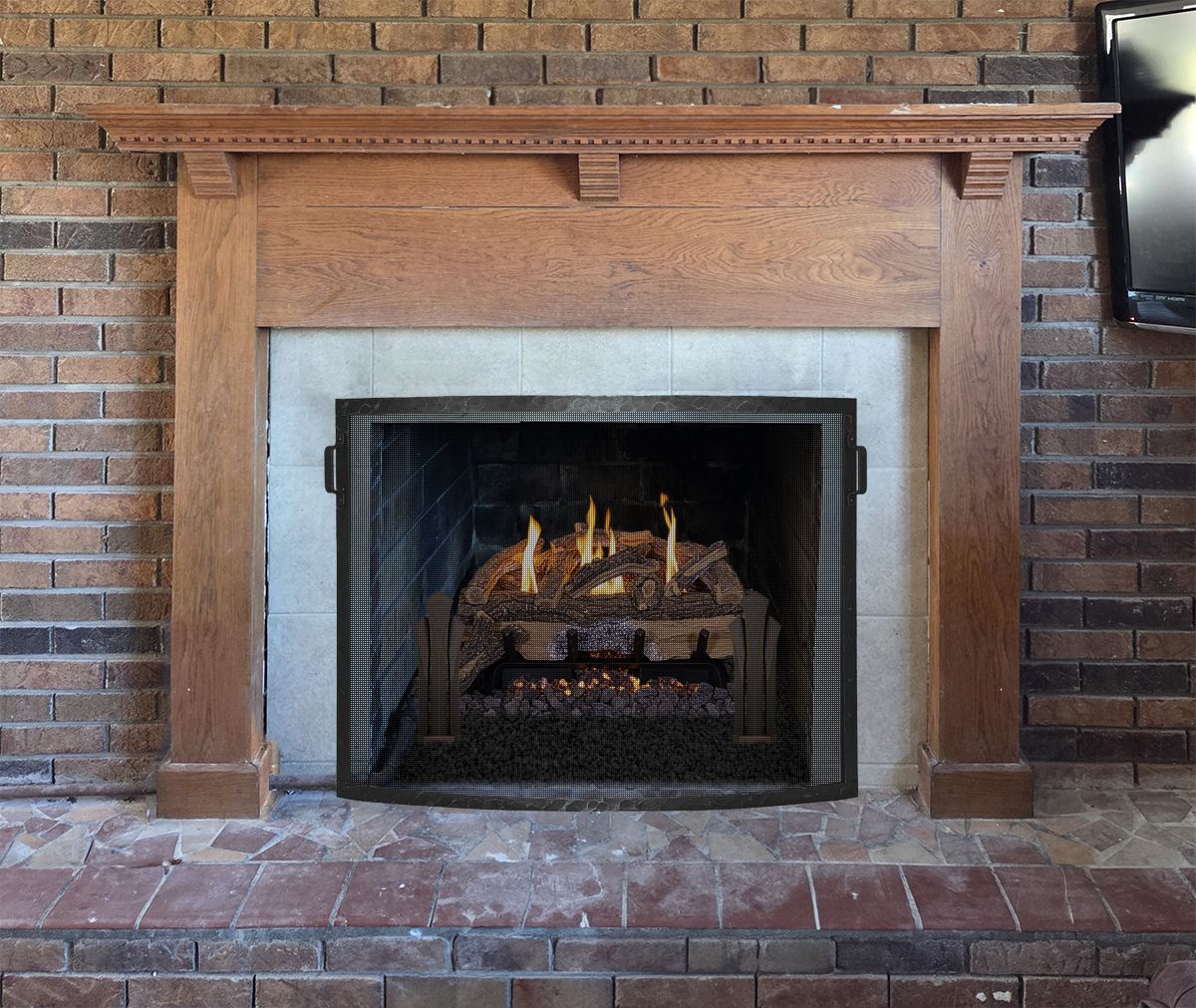 Option #1: Grand Canyon 24" Ventless Weathered Oak Gas Logs. Shown with Framed Mesh Curtain Screen in Black.