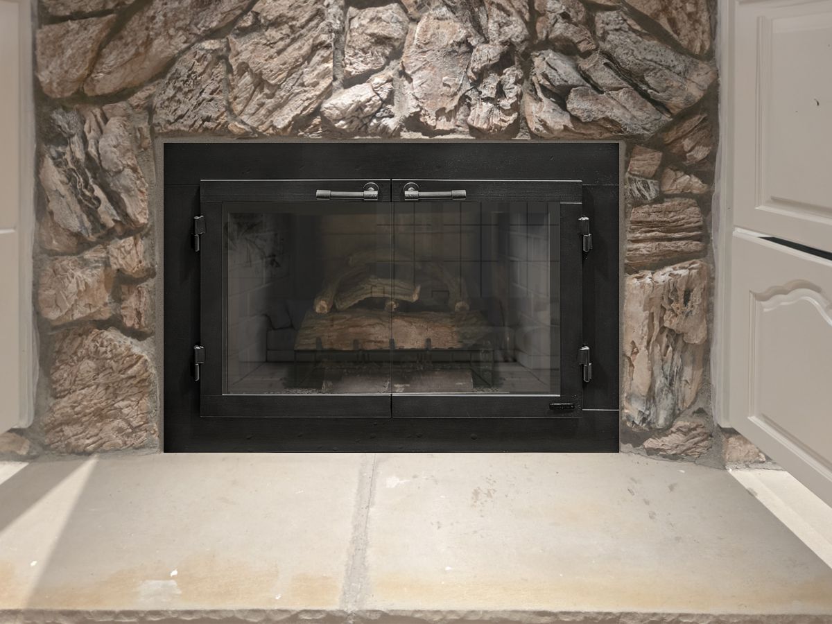 Option #3: Elegant Steel Fireplace Door in Satin Black with Clear Glass and Gate Mesh Backup Doors.