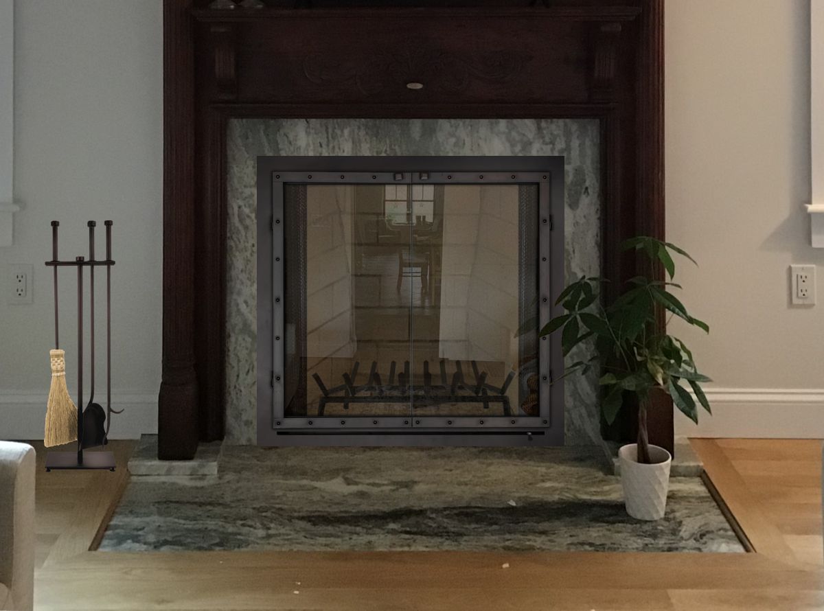 Option #4: Hand Crafted Summerton Wrought Iron Cabinet Fireplace Door in Burnished Black Copper with Tempered or Ceramic Glass and Mesh Curtains. Shown with Matching TSRNT Wrought Iron Fireplace Tools and Custom 3/4" Bar Iron Grate.
