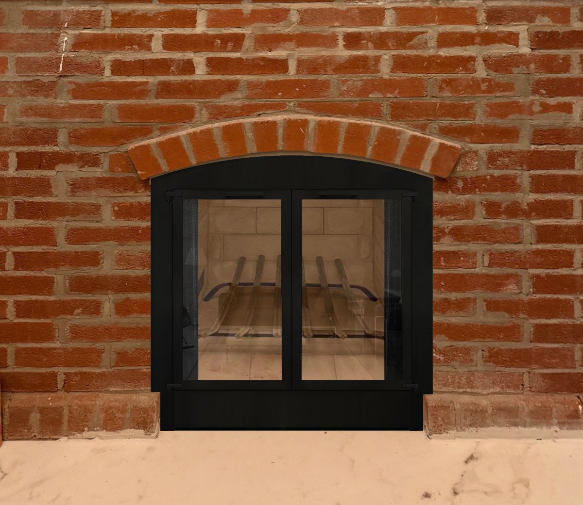 Option #4: Hearth Creations Flat Steel Arched Fireplace Glass Door with Square Doors in Matte Black with Wide Bottom, Tempered or Ceramic Glass and Gate Mesh Backup Doors. The square doors allow the use of mesh curtains that can remain pulled back for a clear view of the fire when the doors are closed.