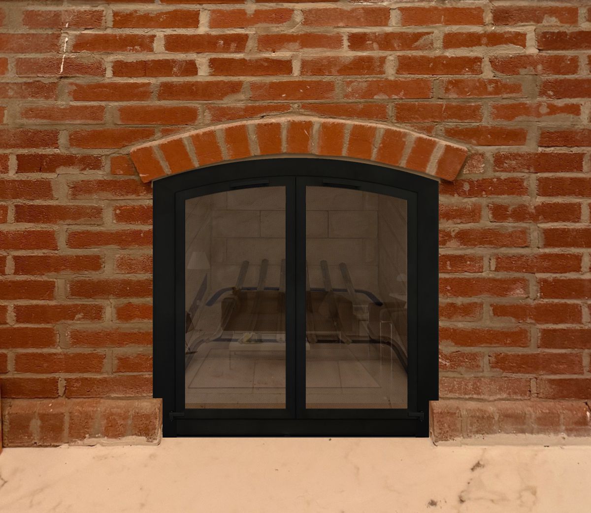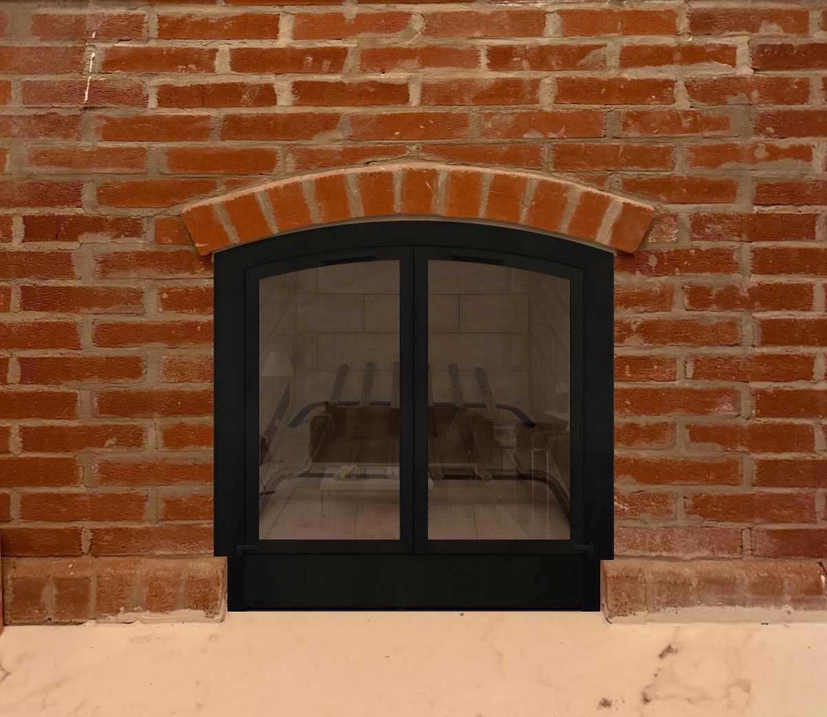 Option #2: Hearth Creations Flat Steel Arched Fireplace Glass Door in Matte Black with Tempered or Ceramic Glass and Gate Mesh Backup Doors.