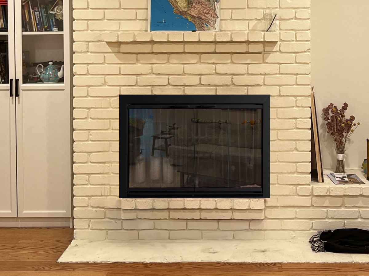 Customer Comments: We have a double-sided fireplace that faces the family room (IMG_3248) and the living room (IMG_1076). I want to replace the doors / metal framing around the brick opening. Currently, we have metal mesh curtains on the family room side, and glass folding panels on the living room side. I was reading your website and saw the glass doors on both sides are recommended. The brick opening is 24.5" wide by 40" tall. We're redoing the mantels, so I'm looking for just simple black metal doors.