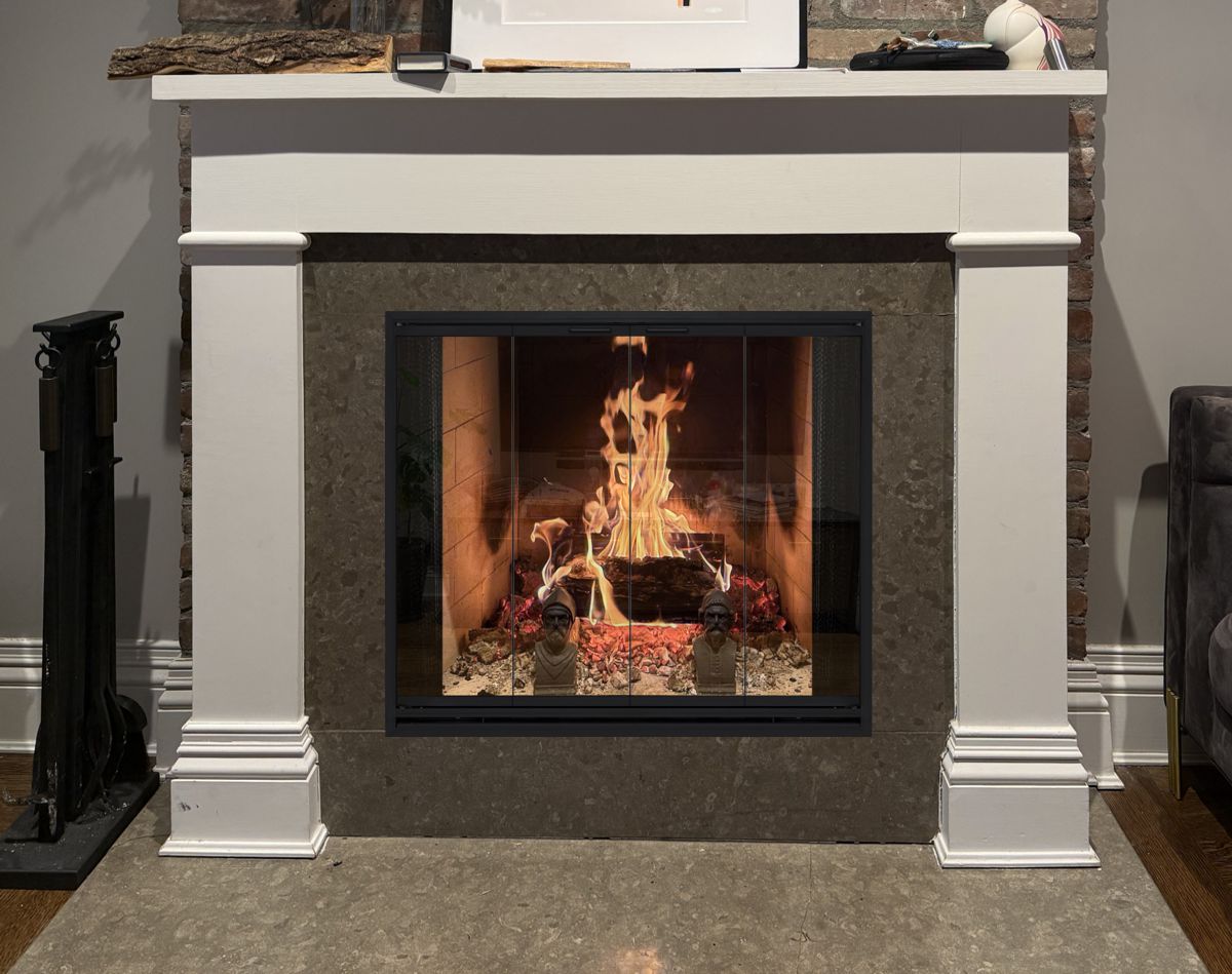 If you are planning on burning anything in your fireplace, you need to have mesh behind the glass so you can burn a fire with the doors open. You can chooe between gate mesh backup doors and sliding mesh curtains. Functionally, gate mesh performs the best as the wire has smaller holes that sparks cannot get through. Aesthetically, mesh curtains may be preferred because they do not have a vertical center frame that obstructs the view of the fire. When you are not using the fire or you want a complete unobstructed view, they do not stick out like gate mesh doors when they are opened.