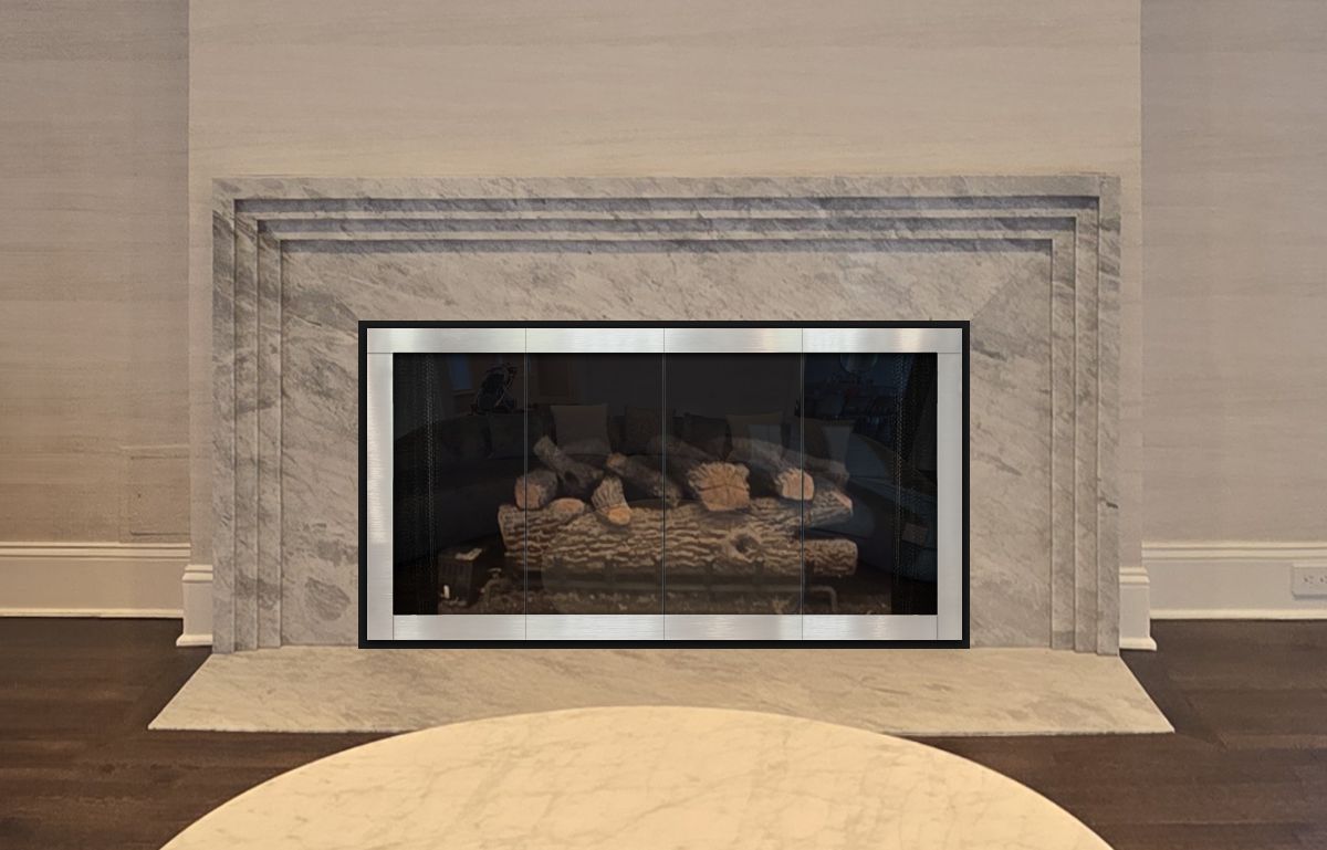 Option #2: Hearth Creations Modern-1 Sleek Steel Fireplace Door with No Visible Handles in Black with Brushed Chrome Overlay Doors and Clear Glass. Includes Gas Log AirWash System for Burning Fires with the Doors Closed.