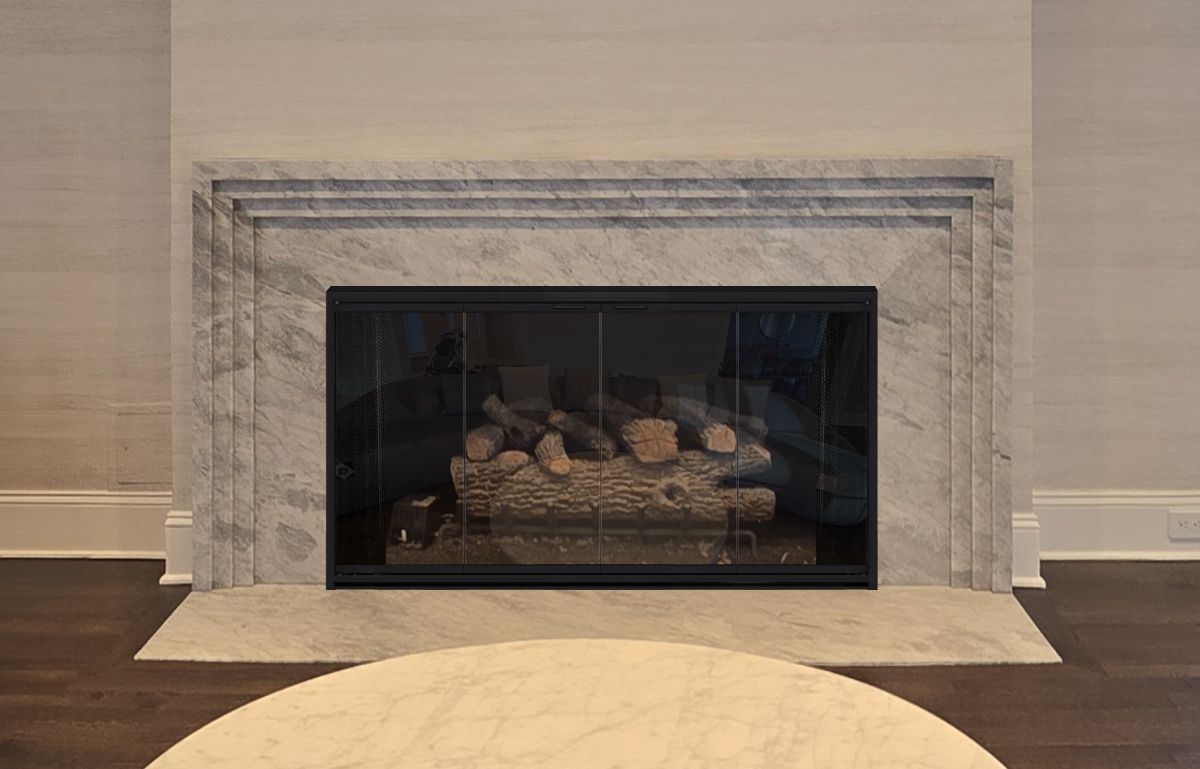 If you are planning on burning anything in your fireplace, you need to have mesh behind the glass so you can burn a fire with the doors open. You can chooe between gate mesh backup doors and sliding mesh curtains. Functionally, gate mesh performs the best as the wire has smaller holes that sparks cannot get through. Aesthetically, mesh curtains may be preferred because they do not have a vertical center frame that obstructs the view of the fire. When you are not using the fire or you want a complete unobstructed view, they do not stick out like gate mesh doors when they are opened.