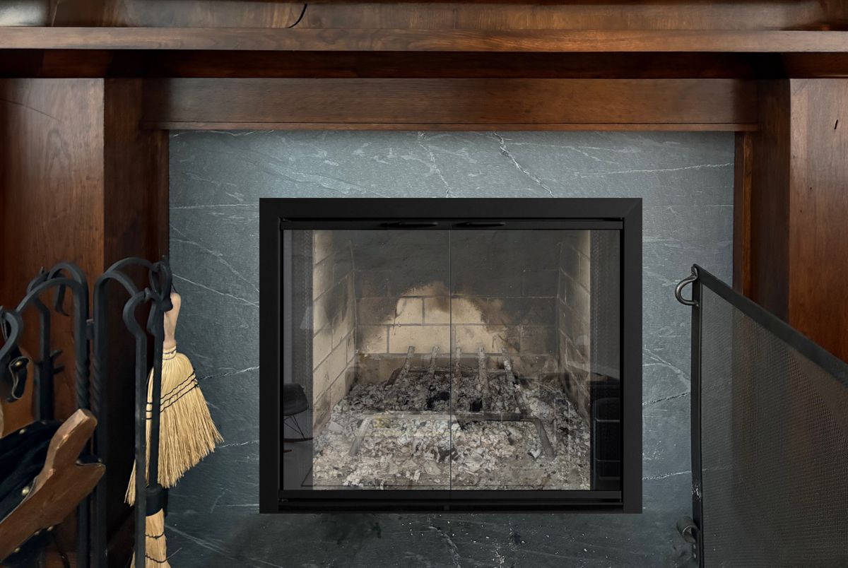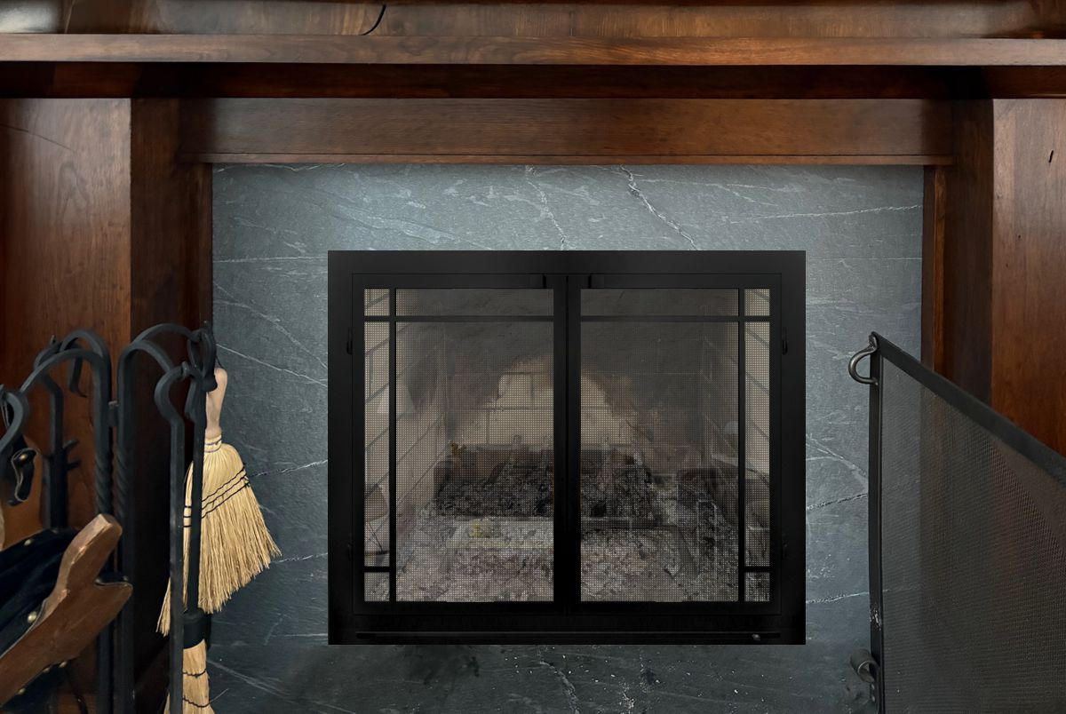 Option #1: PW Creekside Aluminum Cabinet Fireplace Door in Black with Tempered or Ceramic Glass and Mesh Curtains.