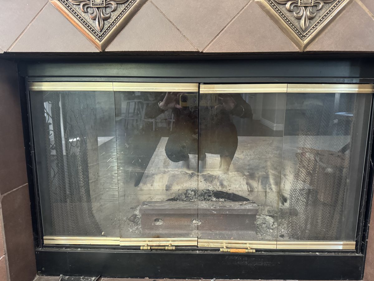 Option #4: Hearth Creations Retrim Bifold Fireplace Door with Scroll Pattern in Black with Gray Glass with Gate Mesh Backup Doors. Made taller than existing opening.