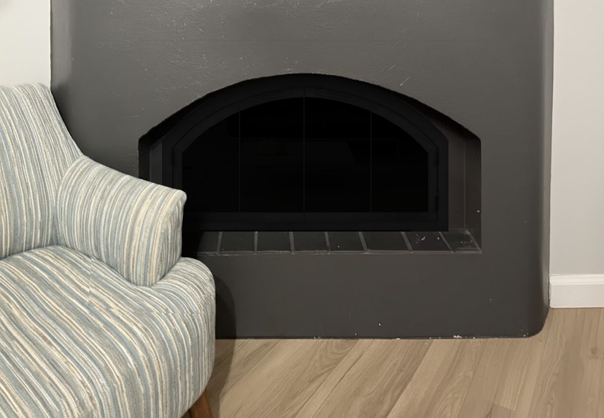 Our Comments: Design Specialties is the only door manufacturer that makes opague black glass that will completely block out the view inside the fireplace. Their arched doors must be attached directly to the black metal fireplace inside, they cannot overlap the plaster wall. Hearth Creations offers and arched door door with gray tinted glass that can overlap the plaster. Adding gate mesh backup doors with gray tinted glass will help block the view inside the fireplace. I am showing both options.