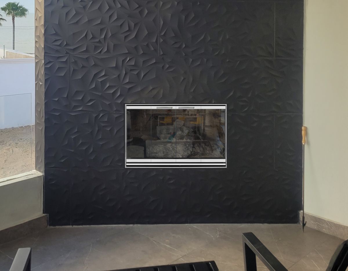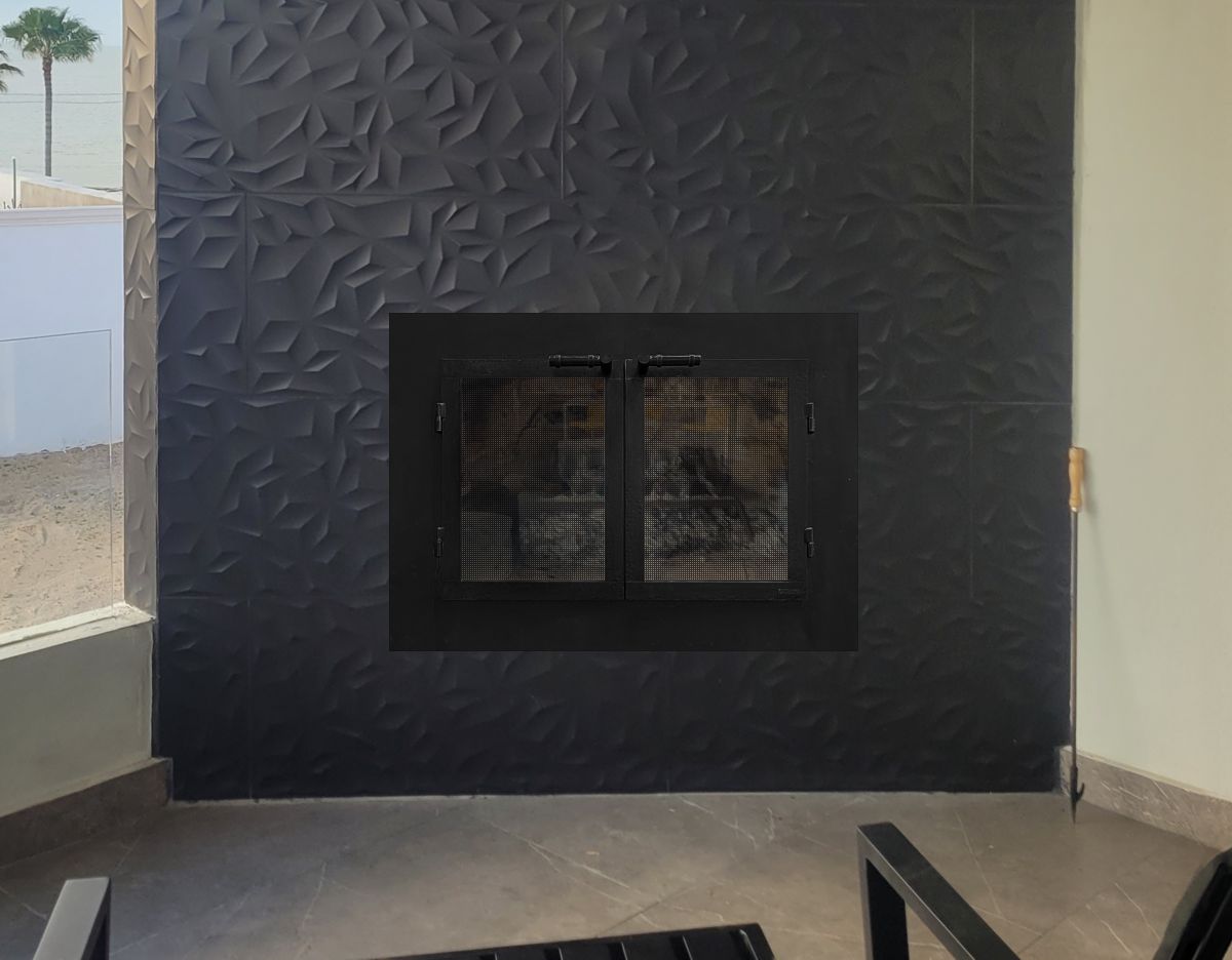 Our Comments: We can have doors made from aluminum or zinc coated wrought iron, both of which will hold up well near the ocean. You can add ceramic glass to burn fires with the doors closed. The narrower framed doors are made to fit inside the opening with a slight gap around that must be filled with grout. The wider framed doors overlap the tiles leaving relatively innocuous gaps between the tile and back of the frame. Mesh curtains or gate mesh backup doors can be added for burning with the doors open, using normal steel or stainless steel.