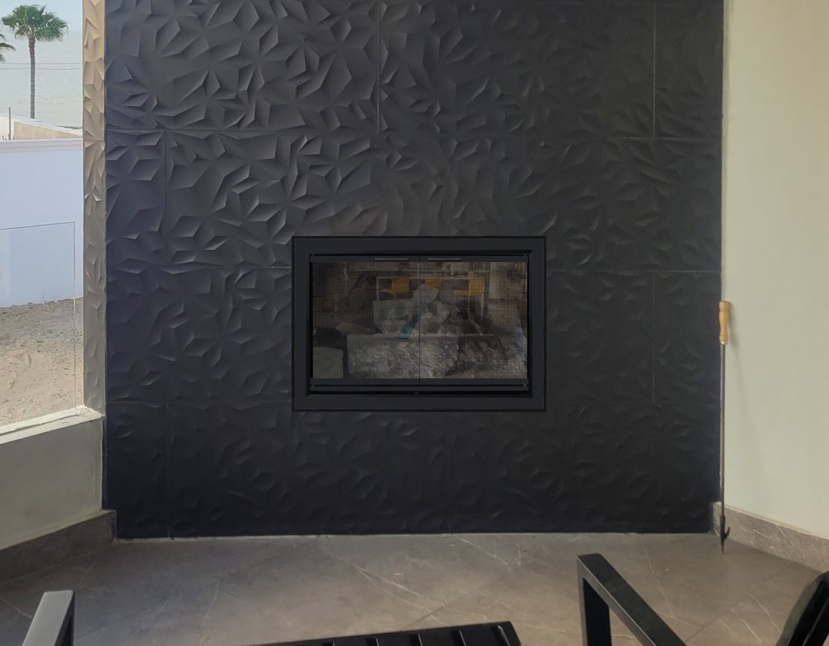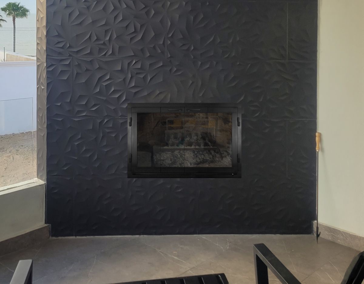 If you are planning on burning anything in your fireplace, you need to have mesh behind the glass so you can burn a fire with the doors open. You can chooe between gate mesh backup doors and sliding mesh curtains. Functionally, gate mesh performs the best as the wire has smaller holes that sparks cannot get through. Aesthetically, mesh curtains may be preferred because they do not have a vertical center frame that obstructs the view of the fire. When you are not using the fire or you want a complete unobstructed view, they do not stick out like gate mesh doors when they are opened.