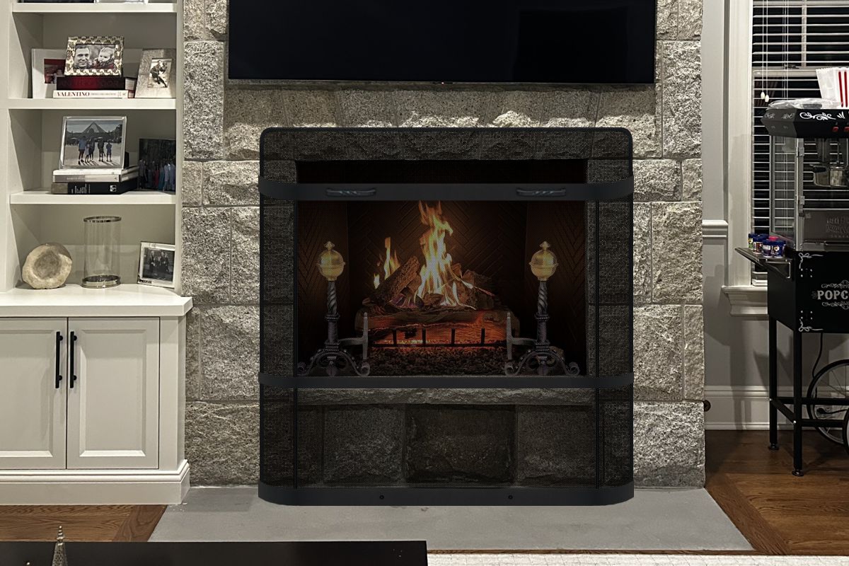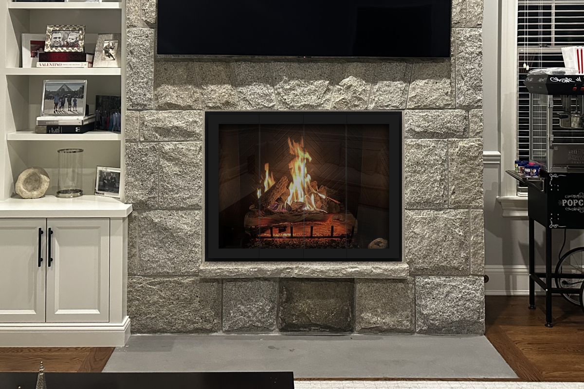 If you are planning on burning anything in your fireplace, you need to have mesh behind the glass so you can burn a fire with the doors open. You can chooe between gate mesh backup doors and sliding mesh curtains. Functionally, gate mesh performs the best as the wire has smaller holes that sparks cannot get through. Aesthetically, mesh curtains may be preferred because they do not have a vertical center frame that obstructs the view of the fire. When you are not using the fire or you want a complete unobstructed view, they do not stick out like gate mesh doors when they are opened.