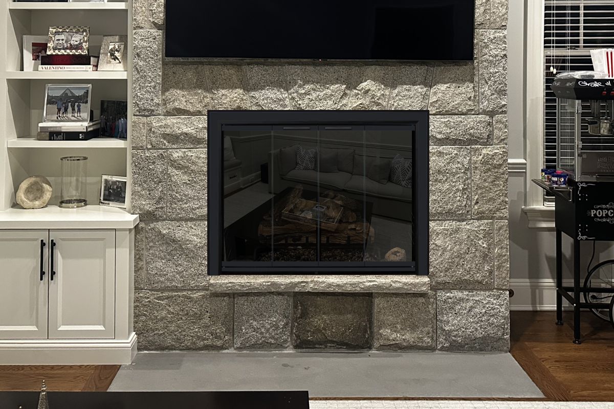 Option #3: Hearth Creations Modern-1 Sleek Steel Fireplace Door with No Visible Handles in Black Clear Glass and Single Gate Mesh Backup Door. Shown as an Inside Fit with Mortar. Includes Gas Log AirWash System for Burning Fires with the Doors Closed.