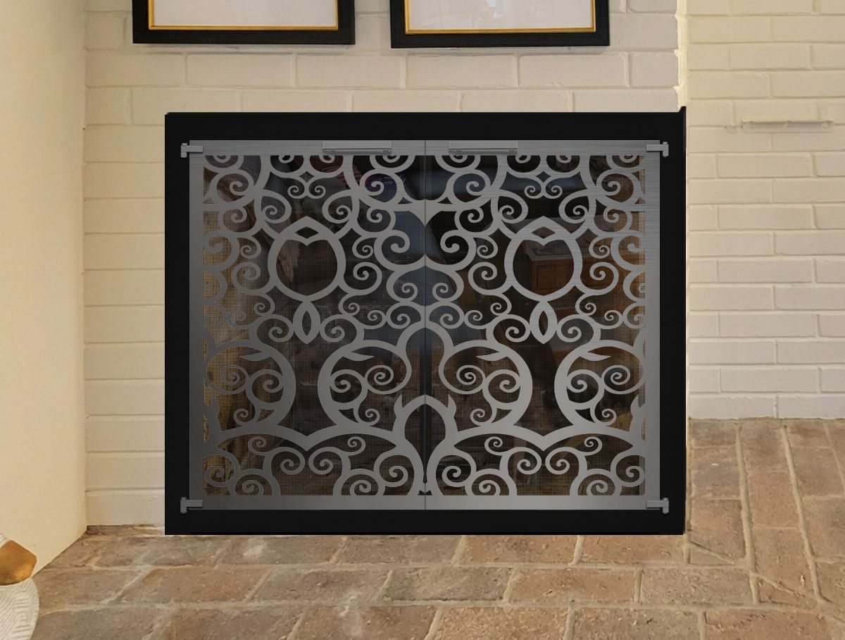 Option #4: Hearth Creations Laser Cut Steel Corner Fireplace Cabinet Door with DXF-810 Design in Matte Black with Antique Steel Doors and Gate Mesh Backup Doors. Tempered or Ceramic Glass.