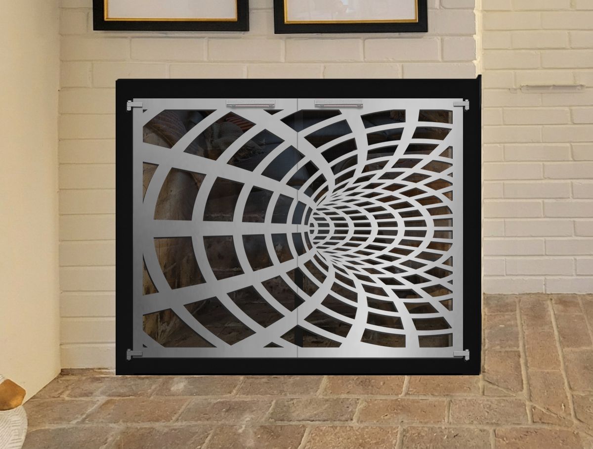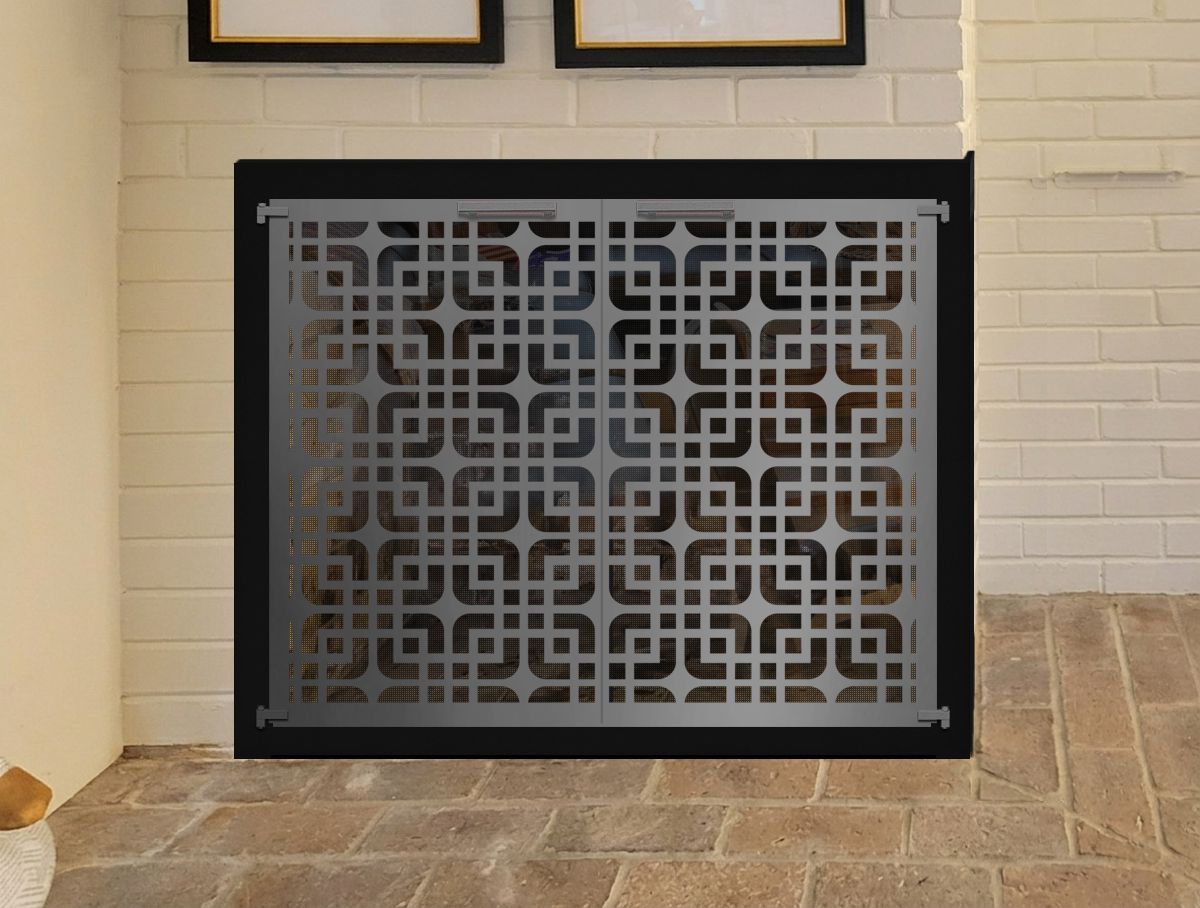 Option #5: Hearth Creations Laser Cut Steel Corner Fireplace Cabinet Door with DXF-9 Design in Matte Black with Brushed Gray Doors and Gate Mesh Backup Doors. Tempered or Ceramic Glass.