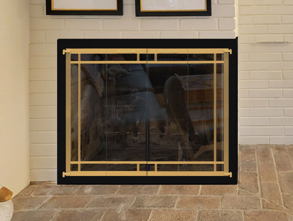 Option #2: Hearth Creations Laser Cut Steel Corner Fireplace Bifold Door with Window Pane Design in Matte Black with Satin Gold Doors and Gate Mesh Backup Doors. Tempered or Ceramic Glass.