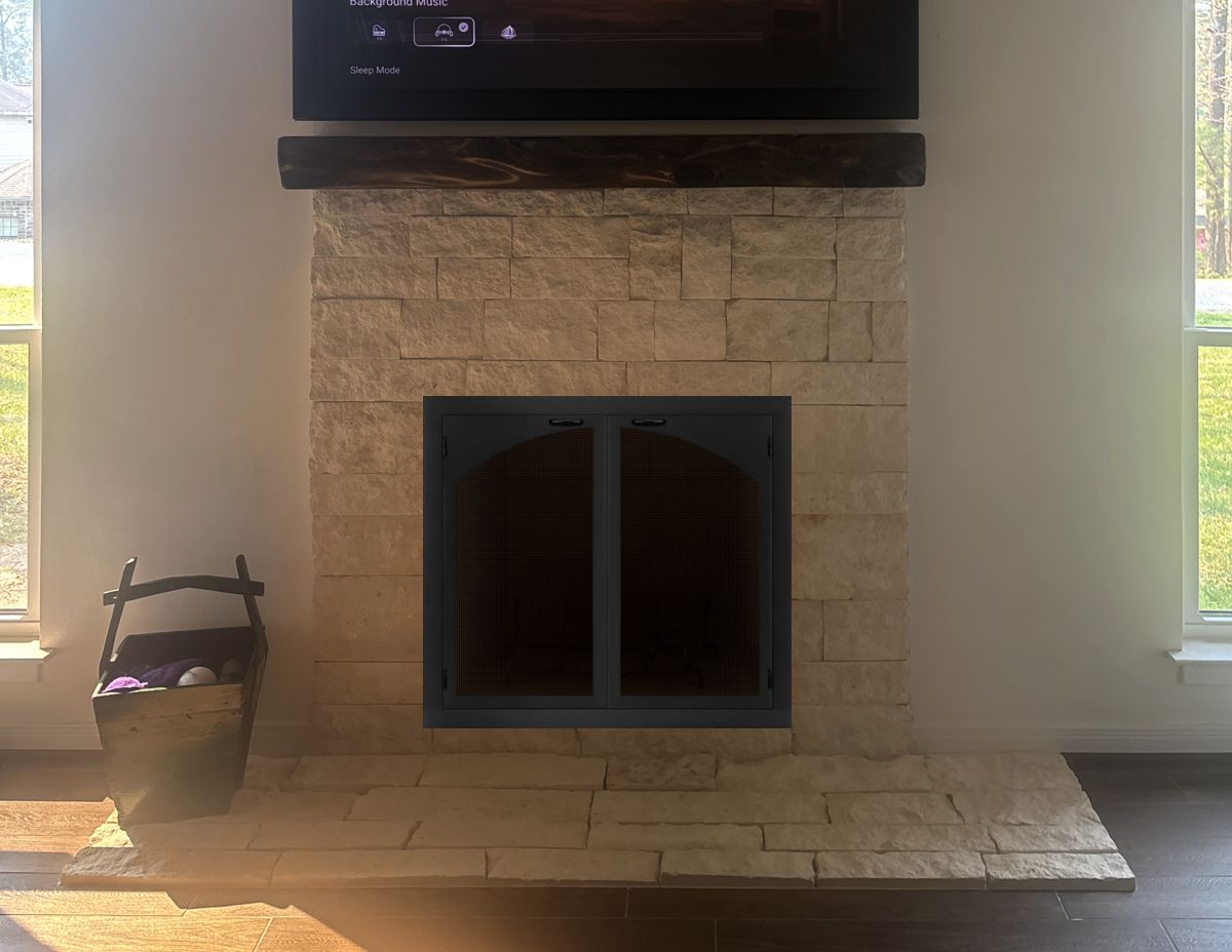Option #5A: Hearth Creations Outside Fit Mesh Door with 1" Deep Frame in Black. You can see the stones behind the arch in this application.