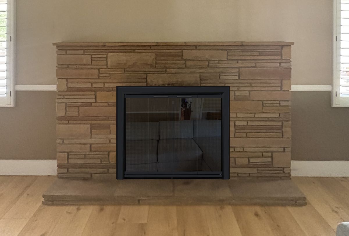 Our Comments: I have created several mockups of doors in black as well as a couple other finishes to consider, although they all can be made black. The main consideration will be whether you want to have the ability to close the glass doors when the fire is burning, in which case you need ceramic glass. I recommend gate mesh backup doors behind the glass, although mesh curtains are an option.