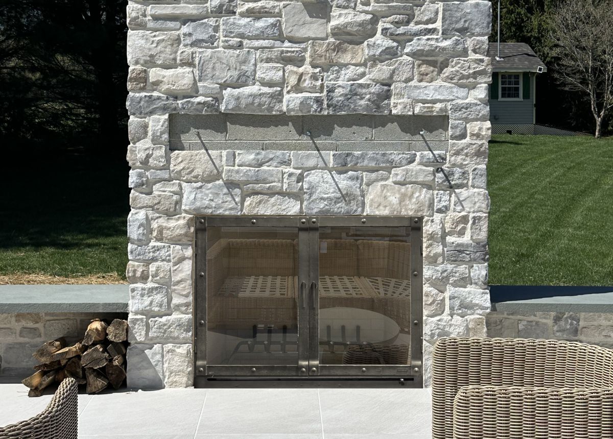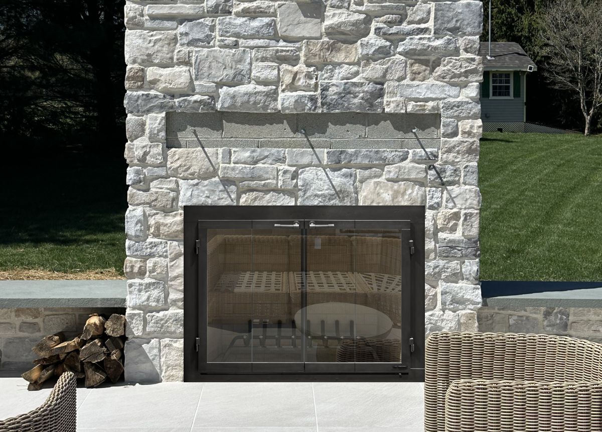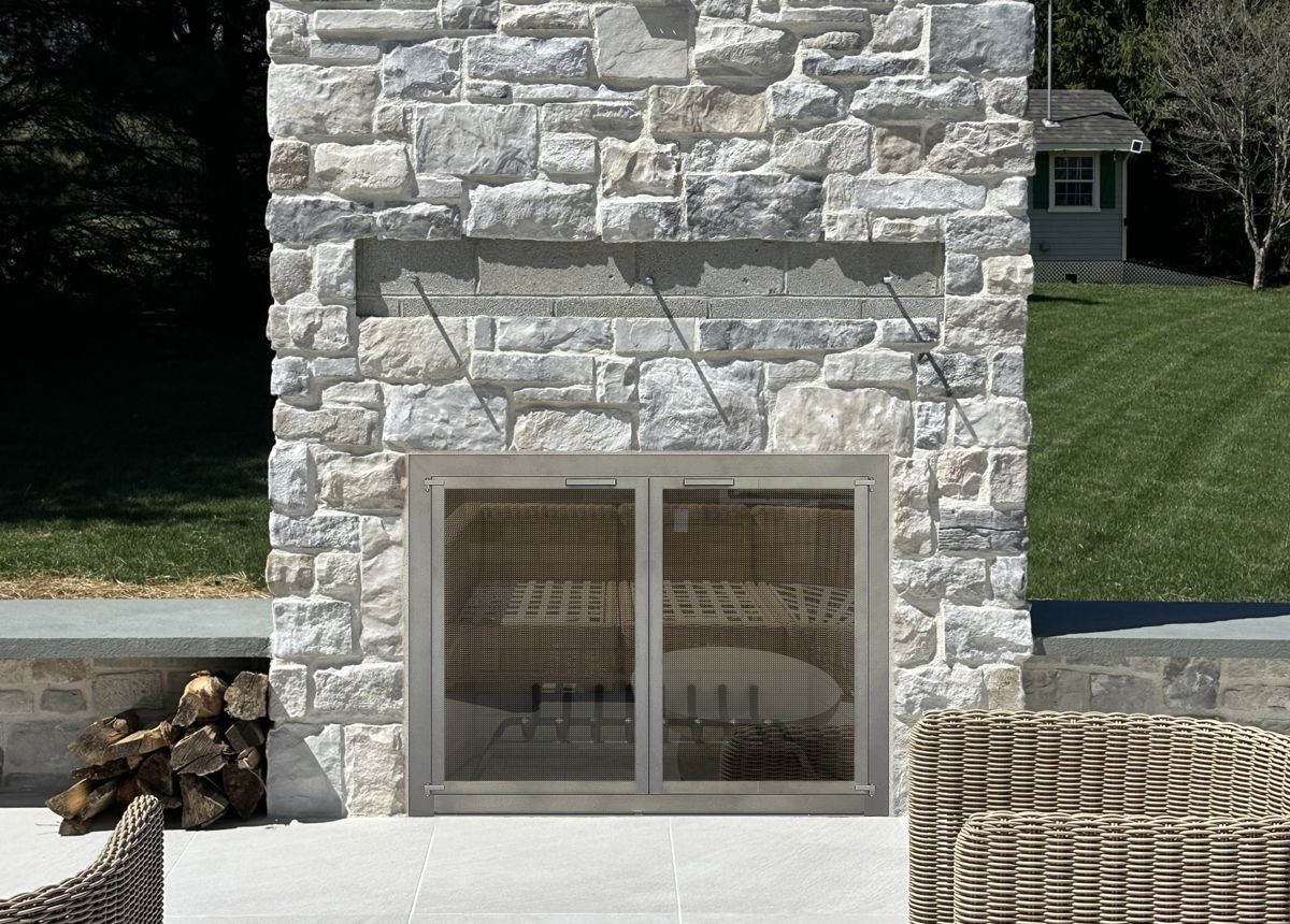 Our Comments: Here are some excellent choices for doors that can be made for this outdoor fireplace. I am showing all of these as glass doors with gate mesh backup doors. If you do not want glass, they can all be made with just the gate mesh. The advantage of glass is being able to close the doors when it gets windy to help prevent smoke and ashes from blowing around. Closing the doors while the fire is burning requires ceramic glass, so all of these doors include ceramic glass as an option.