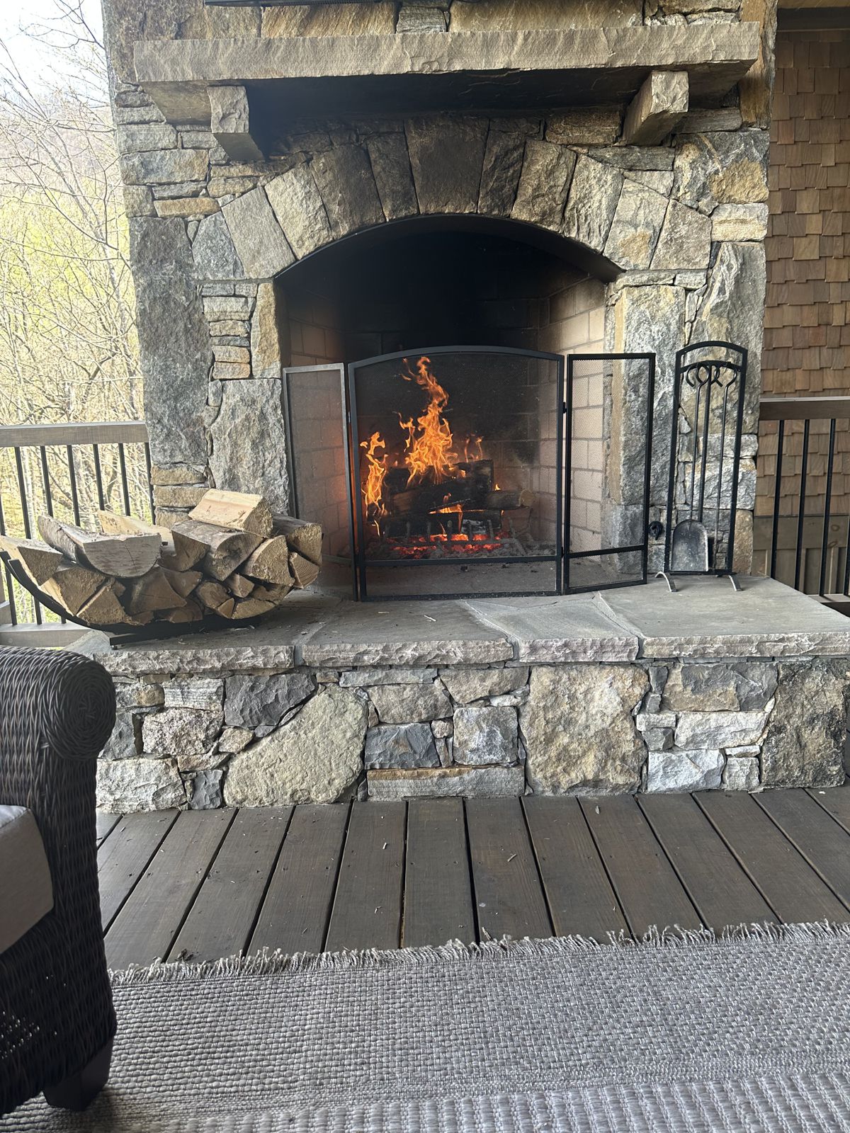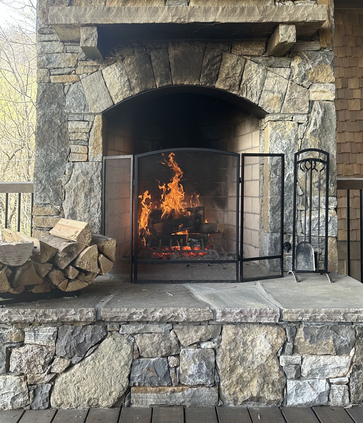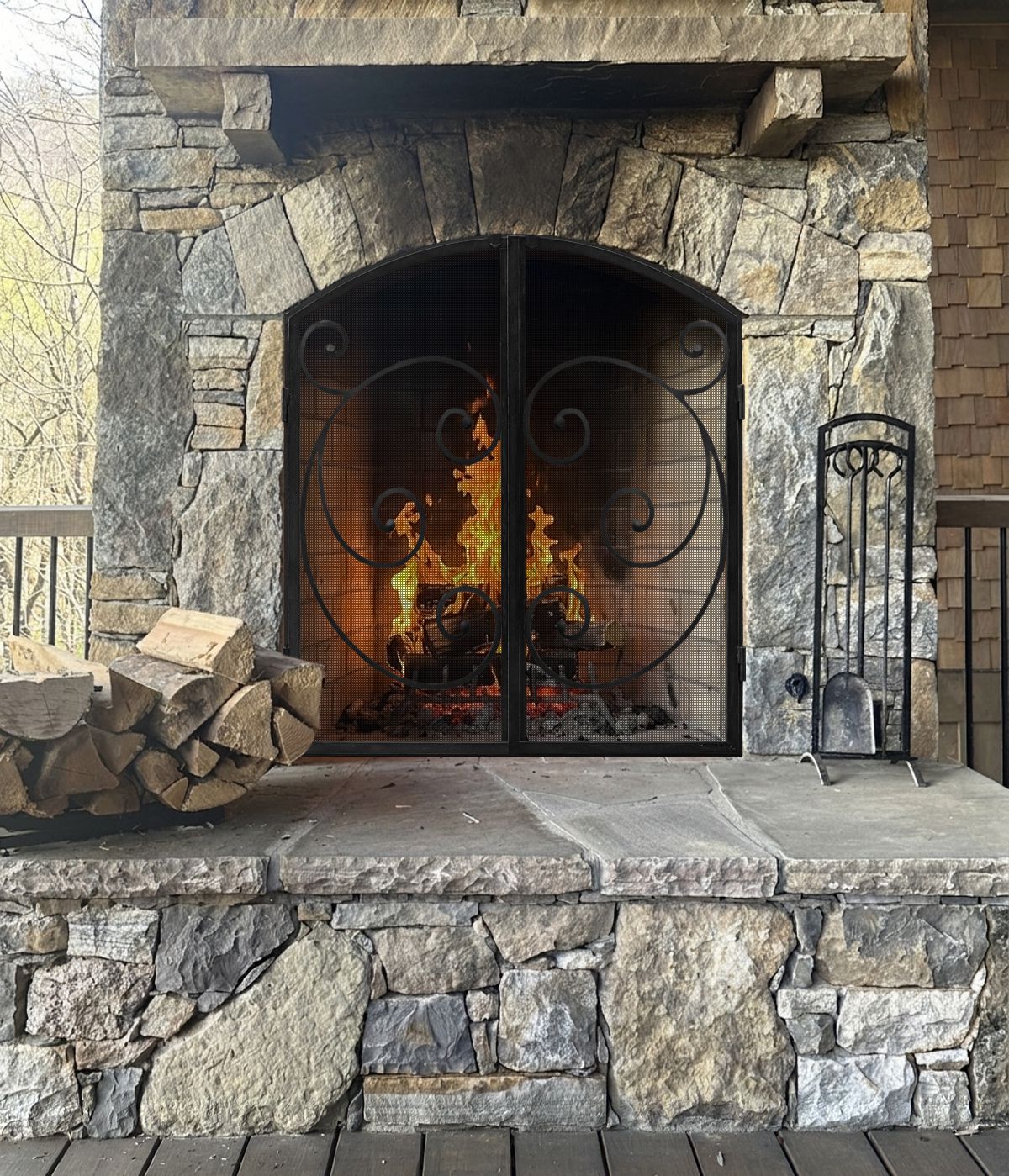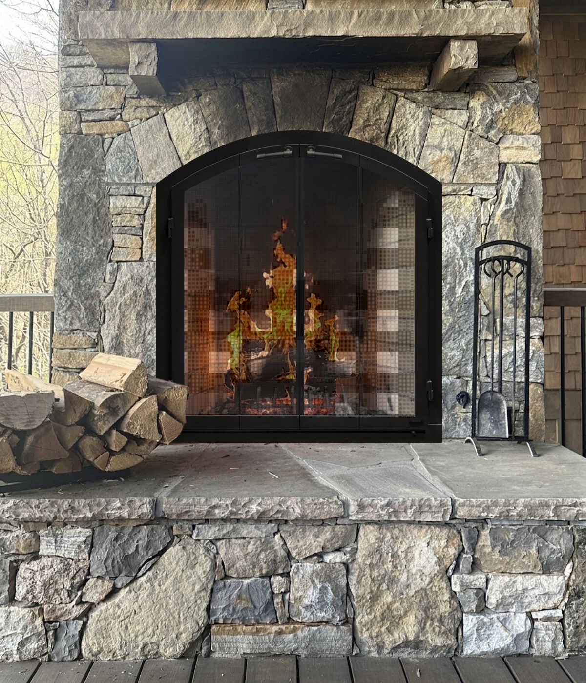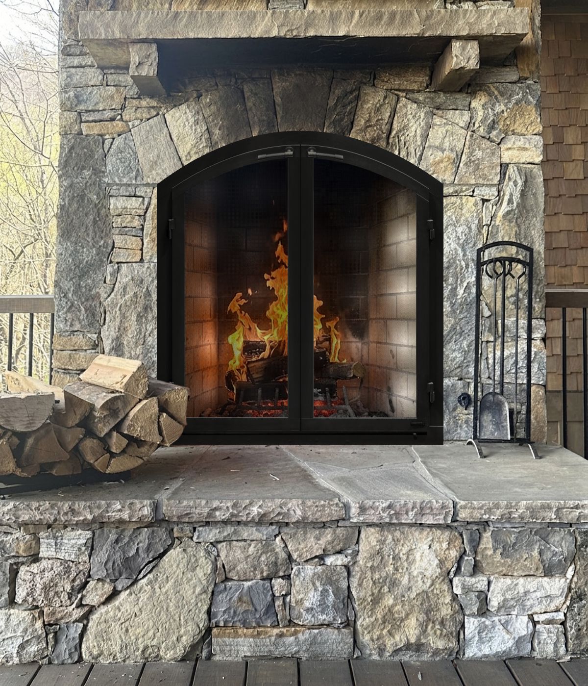 Customer Comments: This is an outdoor fireplace in the mountains on a covered porch approx 40” wide 40” high & 45” at the height of the arch. There are two fireplaces with the same dimensions. I think free standing with mesh doors would make the most sense. I like the idea of one piece but am afraid it would be too heavy to move for placing new firewood inside.