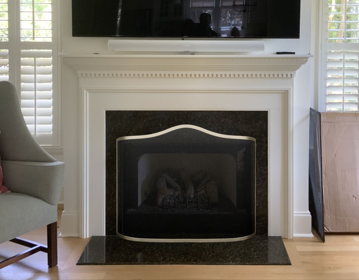 Our Comments: Below are some examples of how I recommend treating a ventless gas fireplace like yours with fireplace screens that are both functional and decorative. The hood creates aesthetic design challenge for a single panel screen that the bowed screens and sparkguards I have presented will overcome.