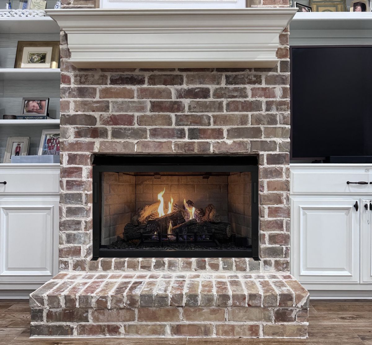Our Comments: This appears to be a ventless gas fireplace. There is very little room on the brick ledge for a free standing screen. If one is used, it must be attached with magnets, otherwise, the feet may be too small for good stability. I have presented several other options to consider including attached screen doors.