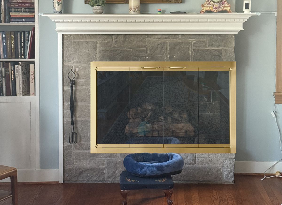 C92 Bar and Mesh with Sliding Mesh Curtains. Shown with C92 Top Bar and F92 Fender in Solid Brass with Old English Finish. The fender helps prevent the screen from being pushed out when a log rolls against it. A protective channel can be added to the fender that the mesh slides in at the bottom to help prevent the mesh from being pushed in by children or pets.