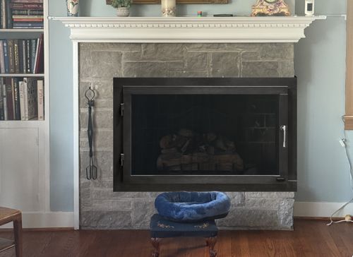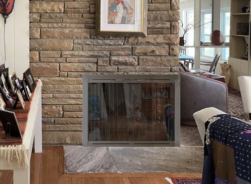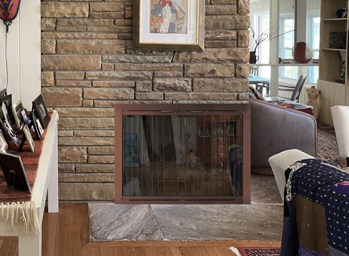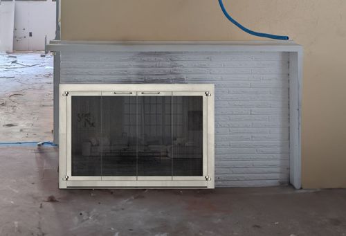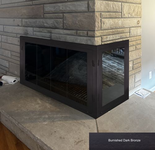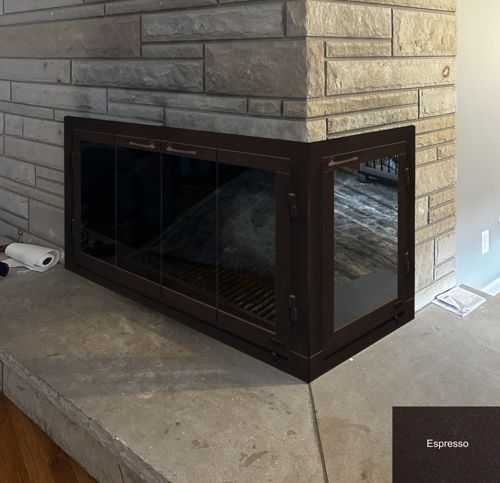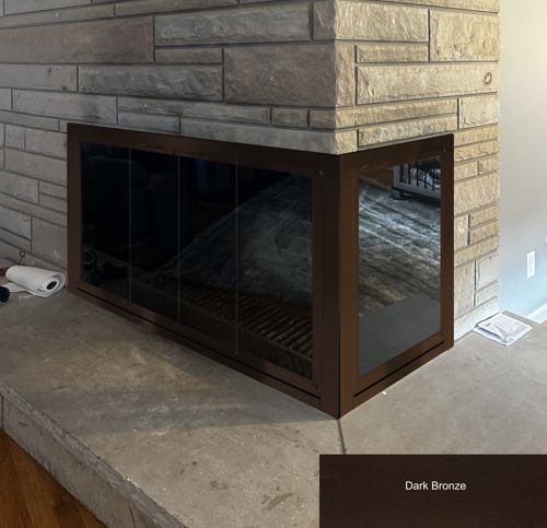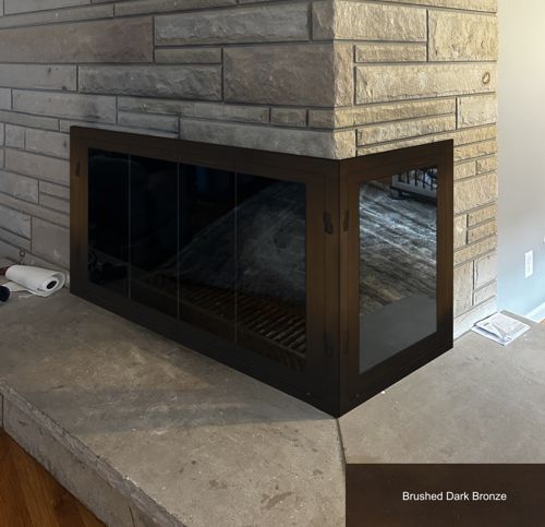 Example #8: Savannah Corner Aluminum Fireplace Glass Door in Rustic Black with Gray Glass. The left side is fixed and the right side is bifold with gate mesh backup doors. The Savannah is a great choice for fireplaces that are a little uneven or have large mortar joints. The frame is wide enough to overlap the fireplace to cover irregularities without being overpowering. It also requires less precision in measuring because we can build in more room for play.
