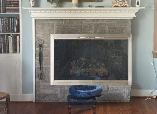Example #10: Minimal Corner Solid Brass Fireplace Door with Satin Nickel Hinges.