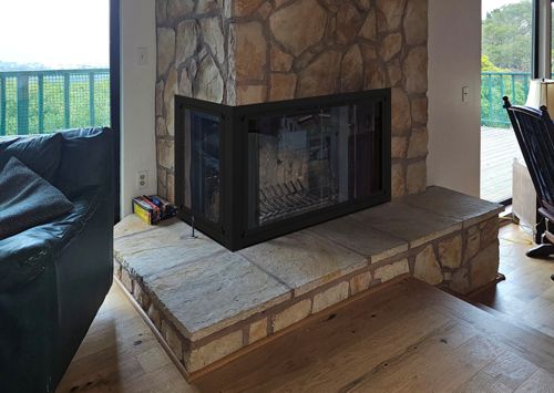 Glass doors for corner fireplaces help reduce drafting problems that are common with multi-sided fireplaces, so they are a popular choice. Most of our Custom Fireplace Glass Doors can be made to fit corner fireplaces even though they may not be pictured that way on our site. Please Email Us Pictures Of Your Fireplace so we can determine which doors will work in your application.