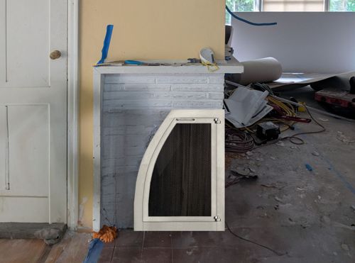Example #7: Design Specialties Legend Corner Steel Fireplace Door with Extra Wide Corner Frame and Custom Fresh Air Vent Cover. The corner post on this fireplace was less than 1" from the opening, which is why the frame had to be made wider at the corner. Typically, the post needs to be at least 1 1/2" back in order to clear the subframe of a steel door.