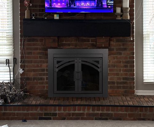 This affordable aluminum fireplace door is designed for masonry fireplaces and is availble in 3 sizes with a hammered black powder coat finish, gray glass and gate mesh backup doors.
