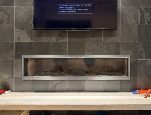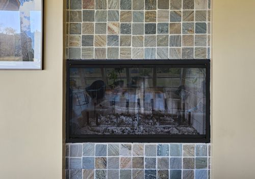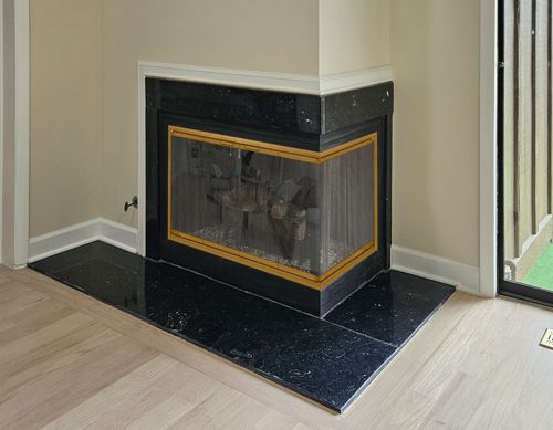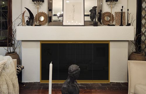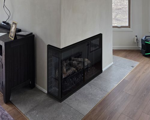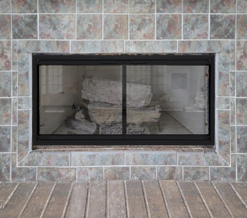 The Design Specialties Stiletto door has a normal frame thickness of 1 5/8", so it projects out with a box-like look. It can also be made with a "Cutback" frame that has a shallow 5/16" thick depth for a more custom flush appearance. The cutback frame should only be used with fireplaces that are perfectly square (within 1/16") due to the minimal overlap that is available.