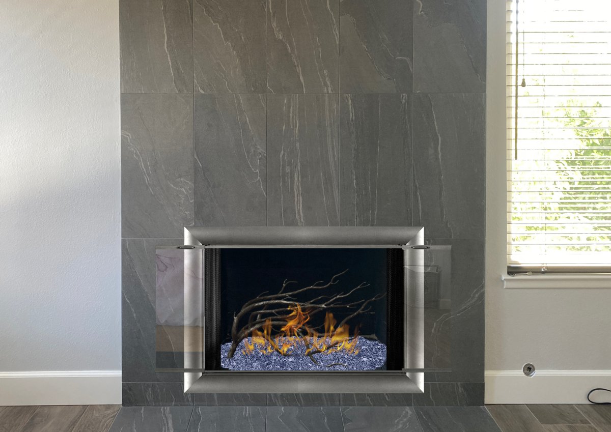 If you are planning on burning anything in your fireplace, you need to have mesh behind the glass so you can burn a fire with the doors open. You can chooe between gate mesh backup doors and sliding mesh curtains. Functionally, gate mesh performs the best as the wire has smaller holes that sparks cannot get through. Aesthetically, mesh curtains may be preferred because they do not have a vertical center frame that obstructs the view of the fire. When you are not using the fire or you want a complete unobstructed view, they do not stick out like gate mesh doors when they are opened.