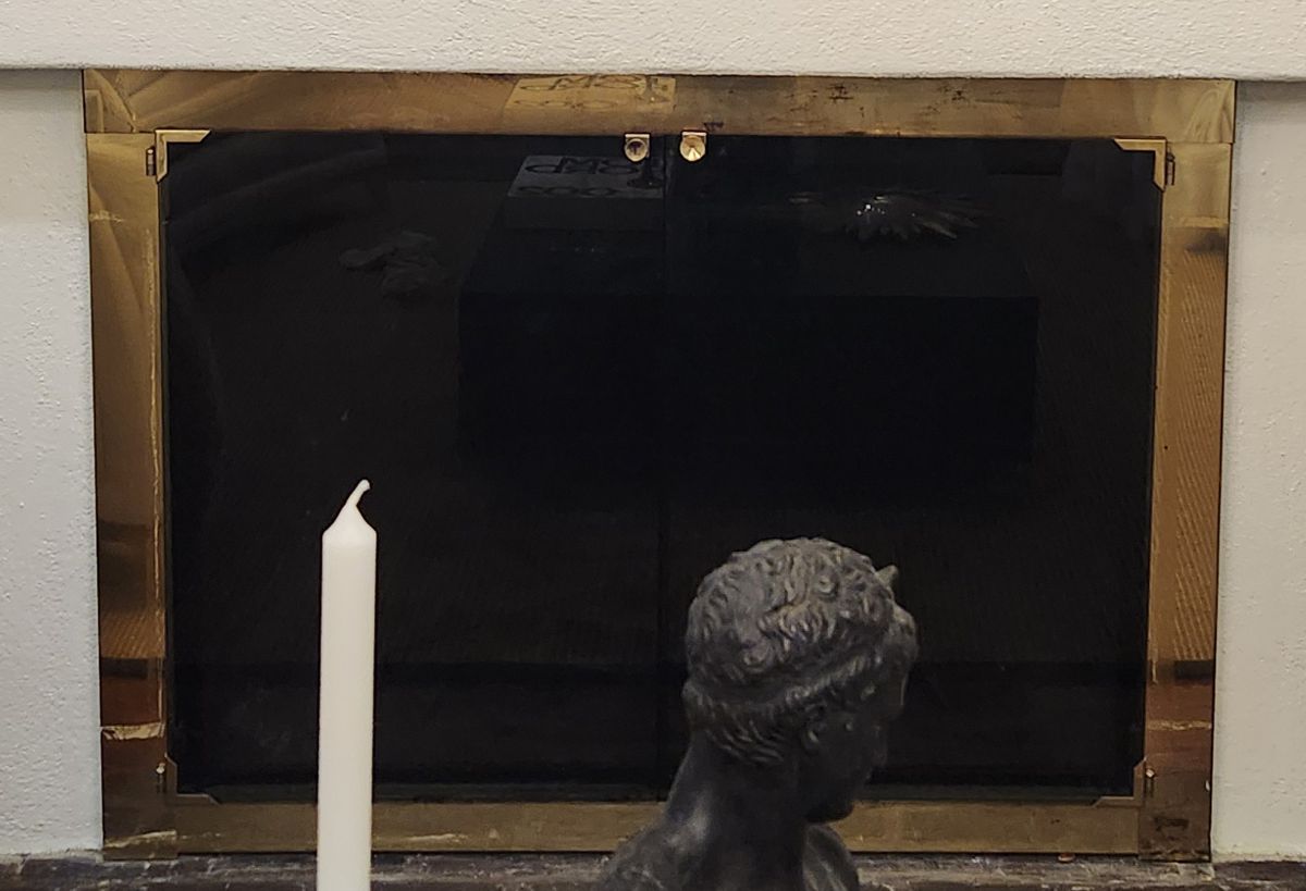 Here is a glass door that creates the illusion that the fireplace is centered on the wall. The glass is opaque black, so you cannot see through it. This allows us to overlap the right side more than the left. This works well with the doors closed, but when they are open, you will see the wall.