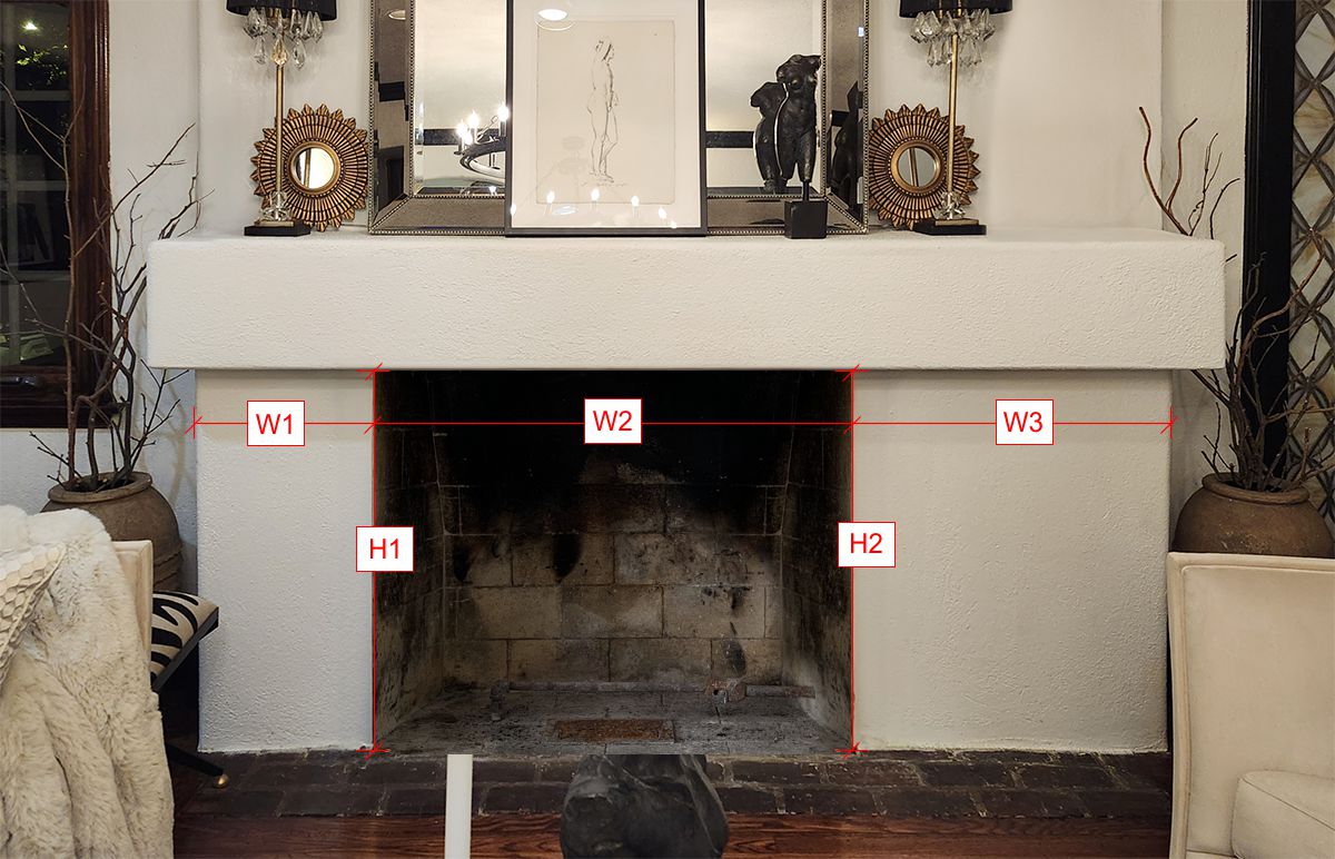 Our Comments: Here are some mockups showing some recommendations I have for glass doors that can be custom made to fit under the overhang above your fireplace. If you are planning on buring fires with doors closed, I suggest getting ceramic glass doors.