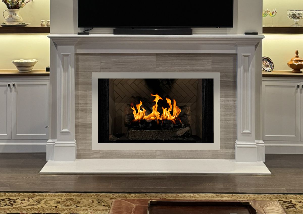 Option #2B: Hearth Creations 11 Gauge Steel Surround in White with Standard Curtain Rod and Mesh.