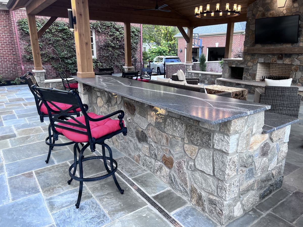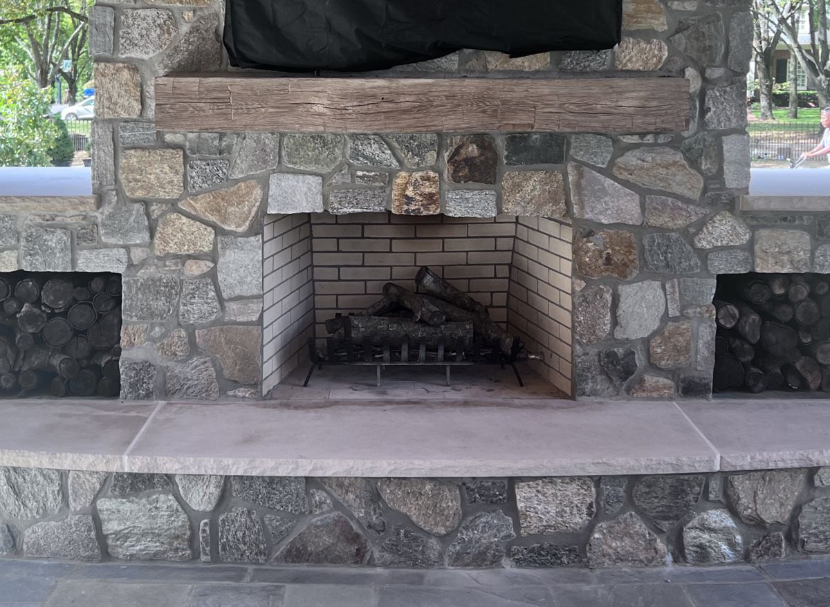 Option #4: Hand Crafted Wrought Iron Bifold Outdoor Fireplace Glass Door in Burnished Black with Ceramic Glass and Mesh Curtains. Shown fitting inside the opening with mortar to fill the gaps.