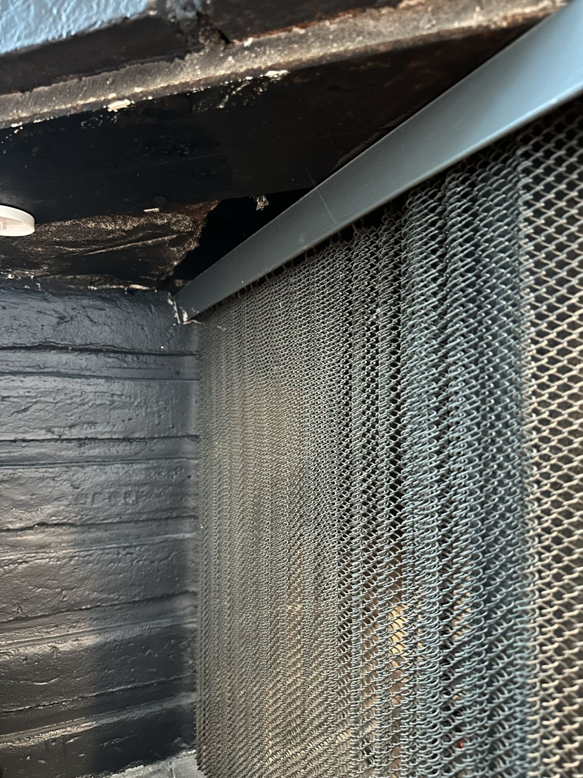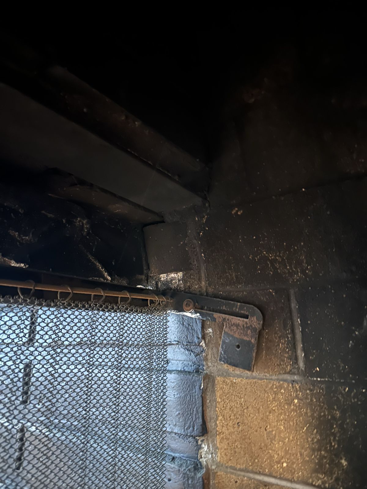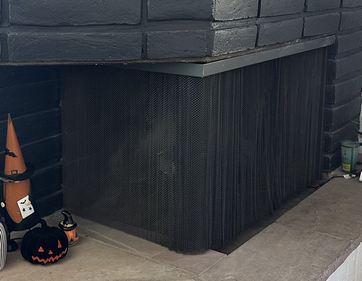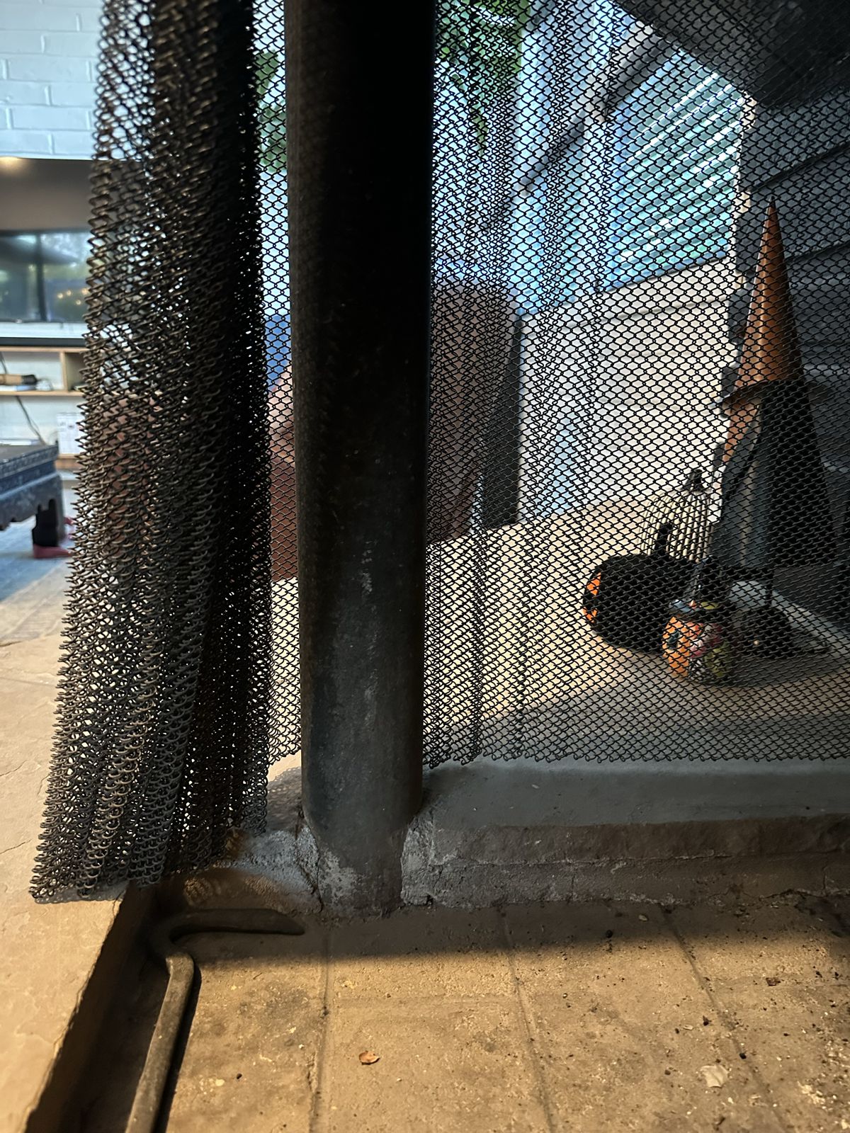 This smoke guard would be made from 3/16" thick solid steel with a steel angle iron base that would be bolted to the floor inside the fireplace behind the mesh curtains.